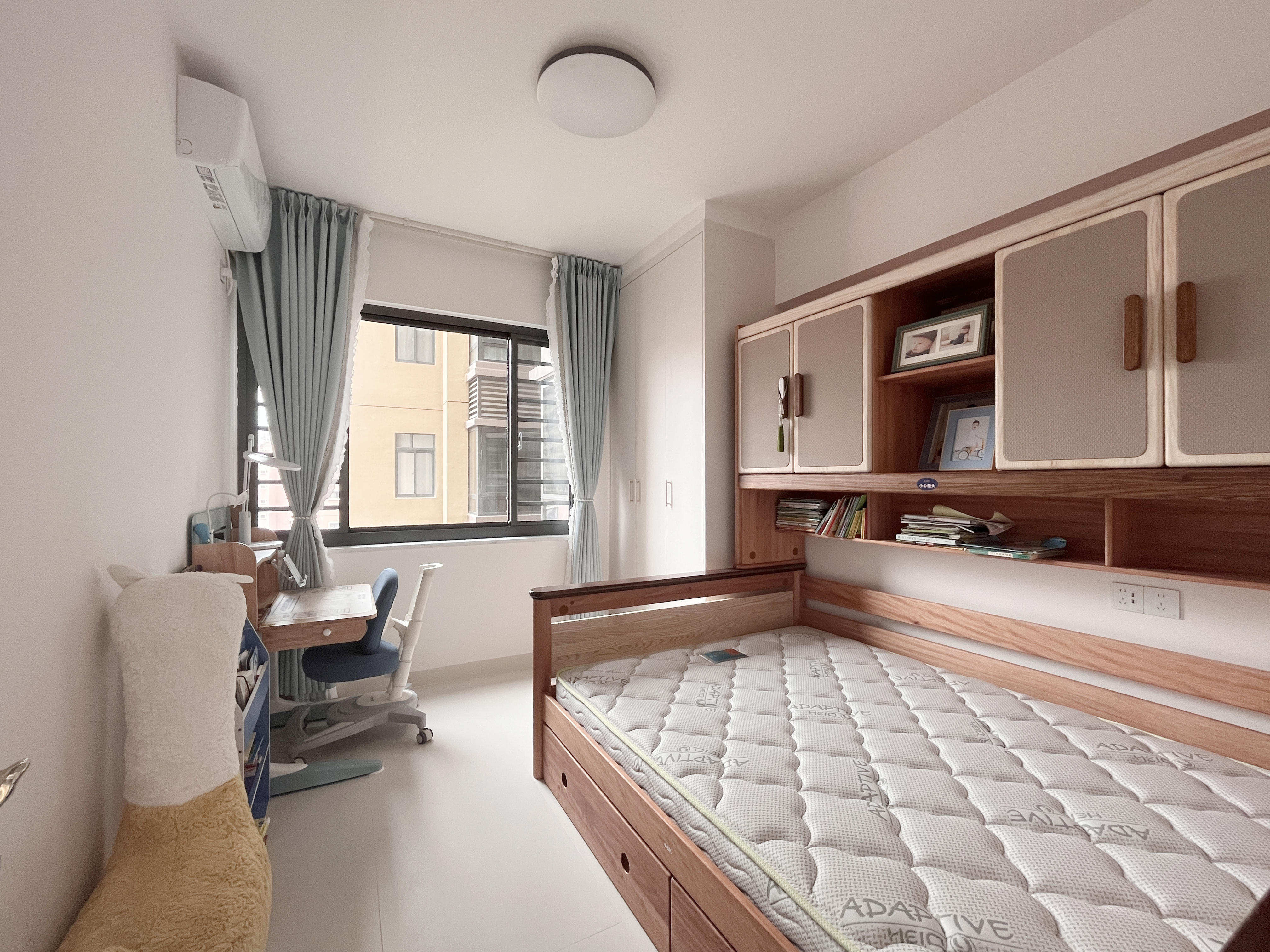 次臥空間更多的考慮了如何把收納空間做的更合理有效,因為本身的空間相對來說是比較少的,所以在次臥的設計上實現(xiàn)了不同房間的不同風格,并保證了走動空間的寬度,舒適且自在。