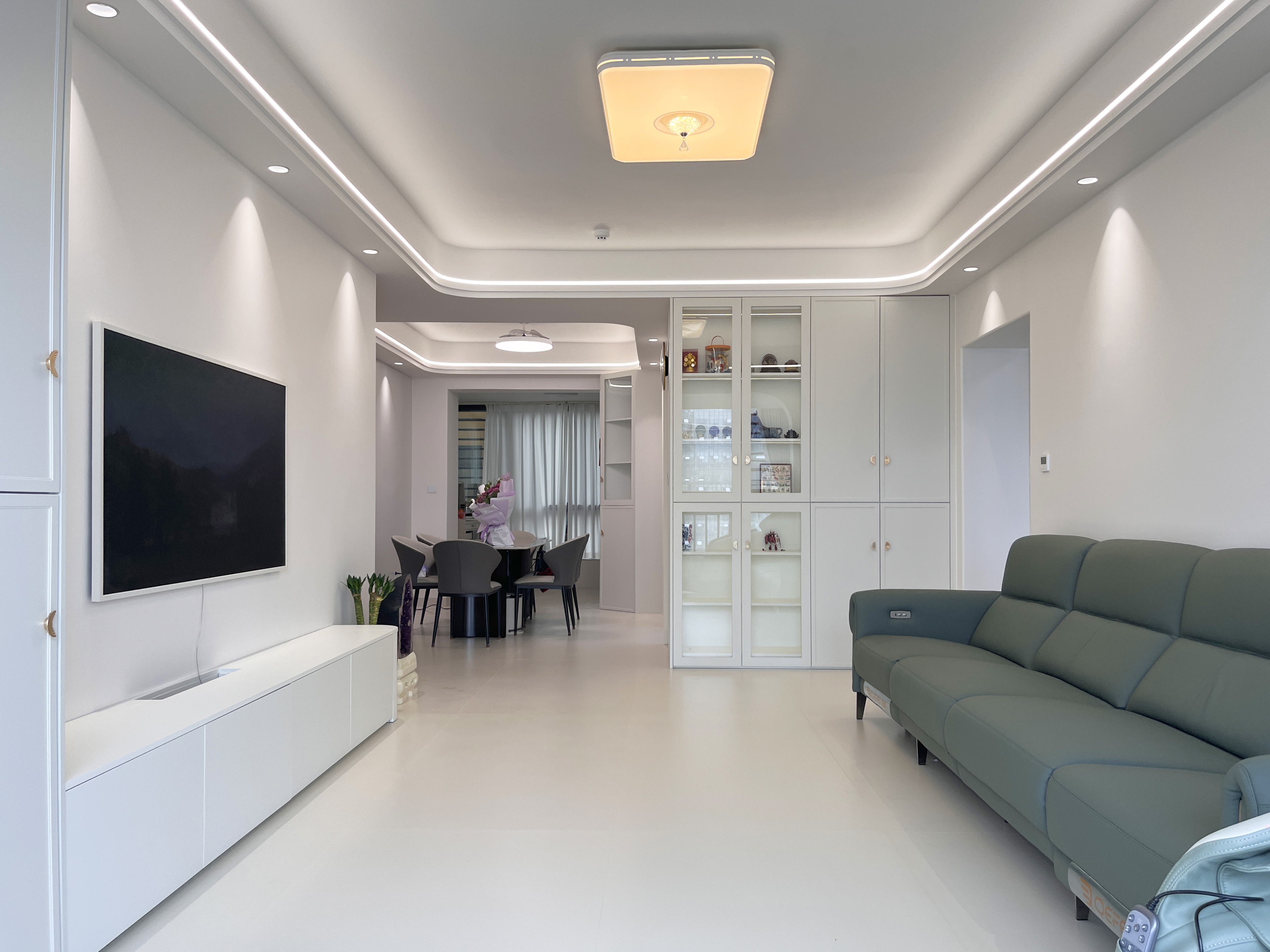 客廳入目就是很純白的色調,有一種高級的留白感,除去白色,沒有多余的顏色“喧賓奪主”,雙眼皮吊頂在造型上加了燈帶,溫馨的燈效能夠增添視覺上的溫馨以及高級感,電視背景墻利用簡單的落地柜實現(xiàn)了一部分的收納,實用且美觀??蛷d的軟裝主要以簡約為主,目前只添置了一個沙發(fā),綠色的顏色選擇給空間很清新的感覺,有很大的視覺跳躍感。