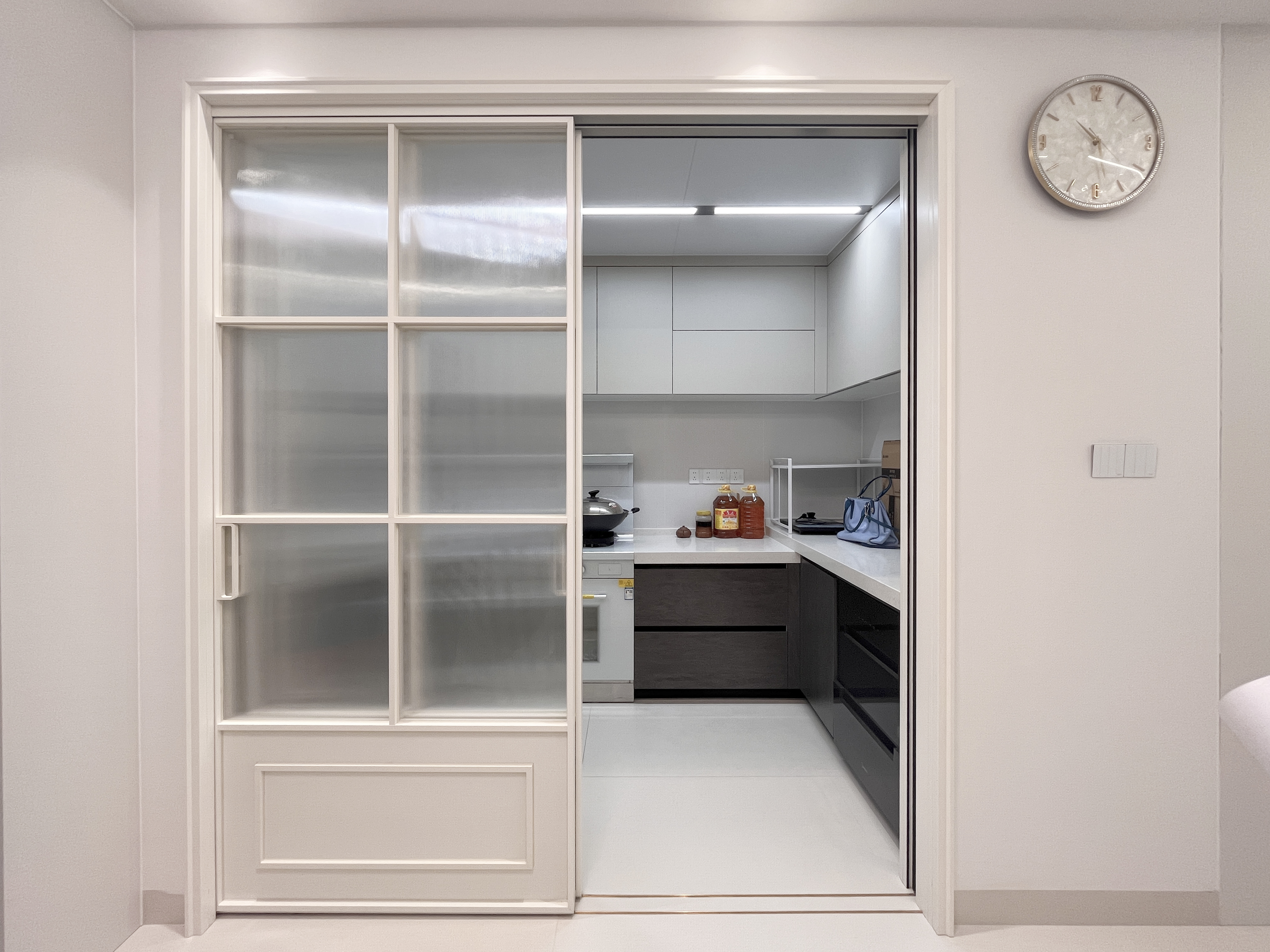 廚房推拉門的選擇跟整體的色調很呼應,一扇門隔開一個油煙空間,保證油煙不外竄。廚房內部色調上的搭配除了盡可能與整體風格搭配以外,還選擇了相對來水比較耐臟的櫥柜顏色,下面部分如果有了水漬也比較容易清理,而上部分的櫥柜則是能最大限度地與公共空間融合,增加視覺上的空間感。