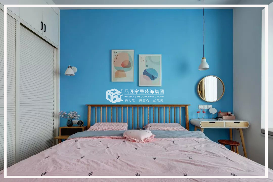 主臥用一面藍色的背景墻