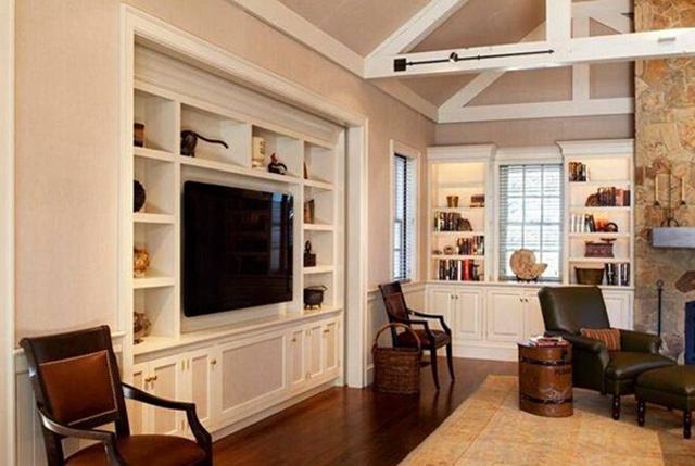 收納型電視背景墻一直以來都很受歡迎,定制一面一體式組合柜,美觀又實用,完美解決客廳的收納難題,即可以用來儲物,也可以用來擺放一些工藝品。如果家里沒有書房,把電視背景墻做成書柜的形式,也是個不錯的選擇。