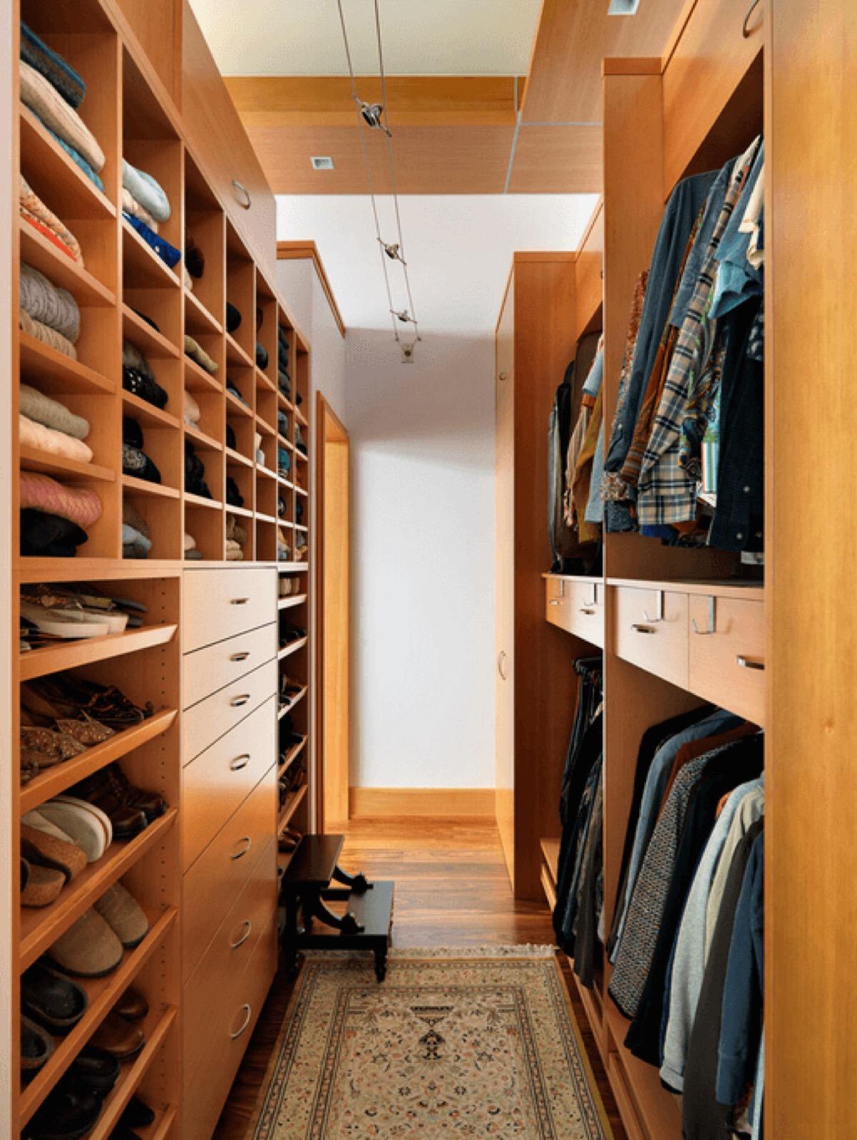 嵌入型的衣帽間能最大程度上節(jié)約空間,只需要空出一個(gè)3-4平米的小地方,安裝好衣柜以及鏡子,就能成為一個(gè)小型的衣帽間。平開門的衣柜或者不適合用在此處,可以考慮選用推拉門的設(shè)計(jì),或者選用布簾進(jìn)行遮擋,防止進(jìn)灰。