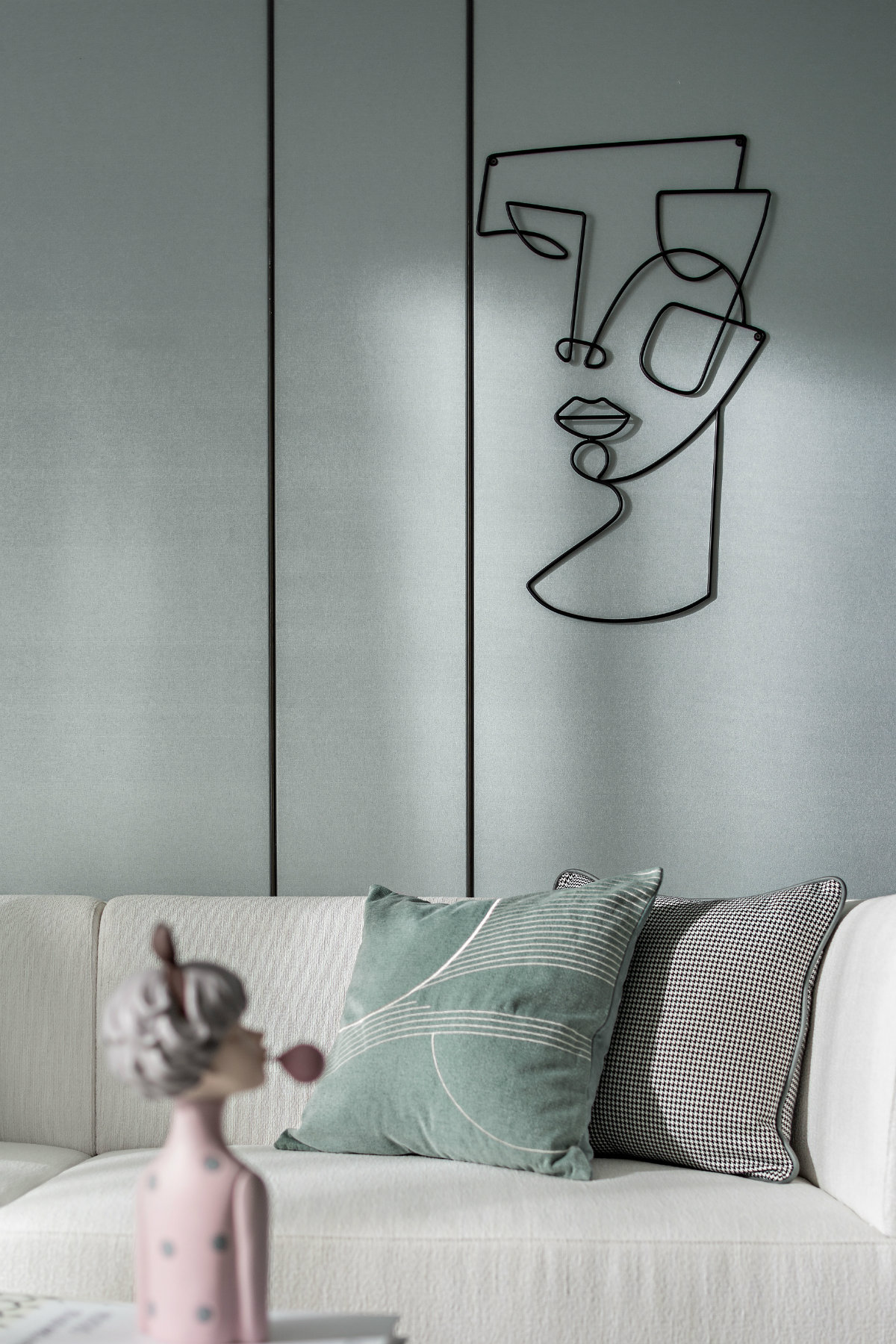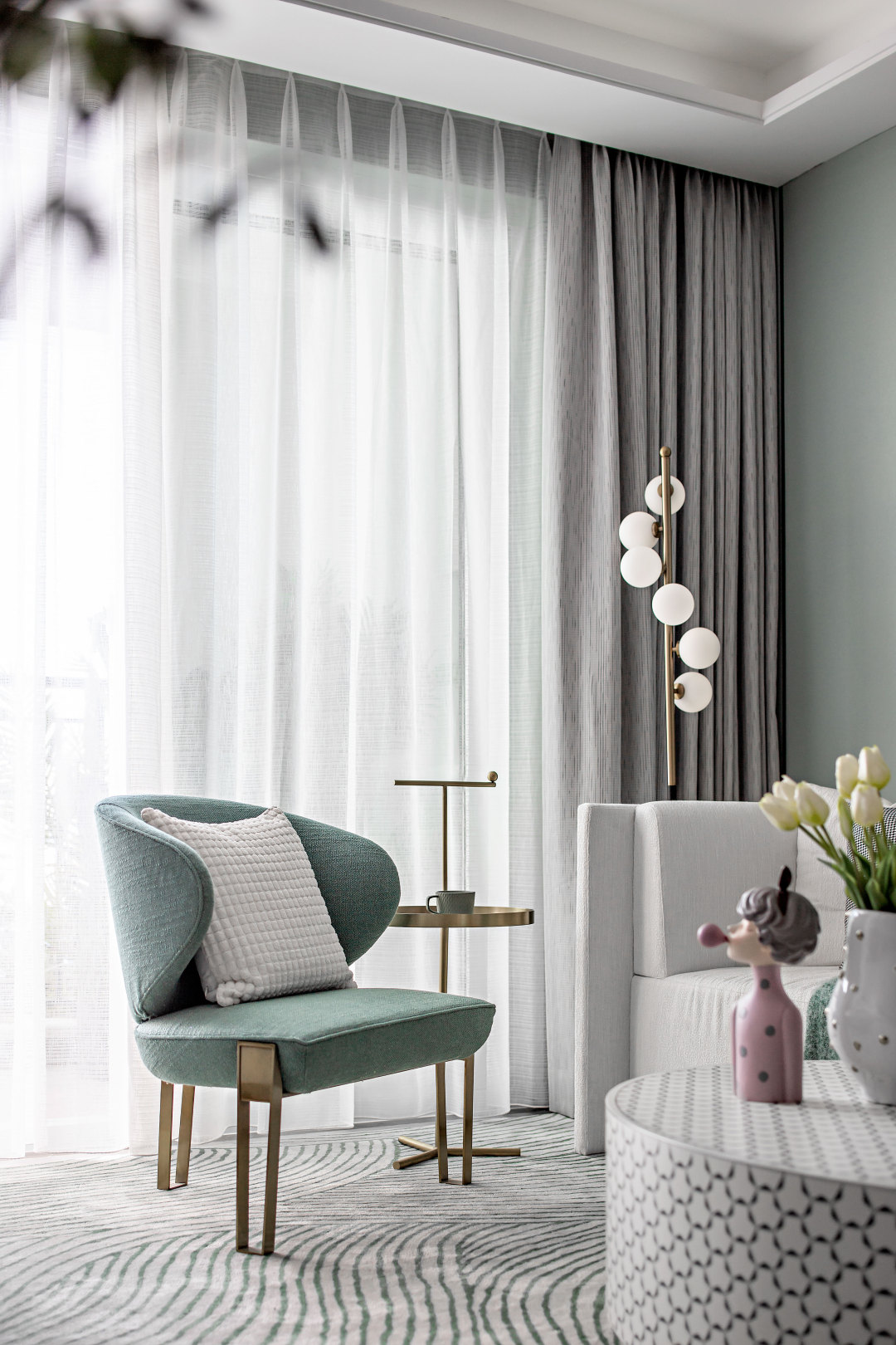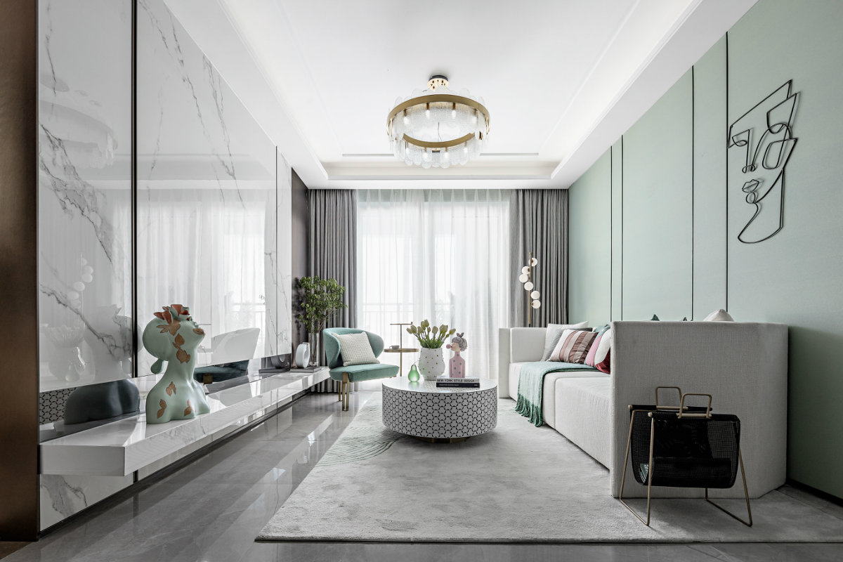 進(jìn)門,映入眼簾的都是春天的色彩,整體色系簡單清新,馬卡龍綠的墻面是春天的顏色,低飽和度的軟裝點綴上少量的金屬元素,簡潔又精致。