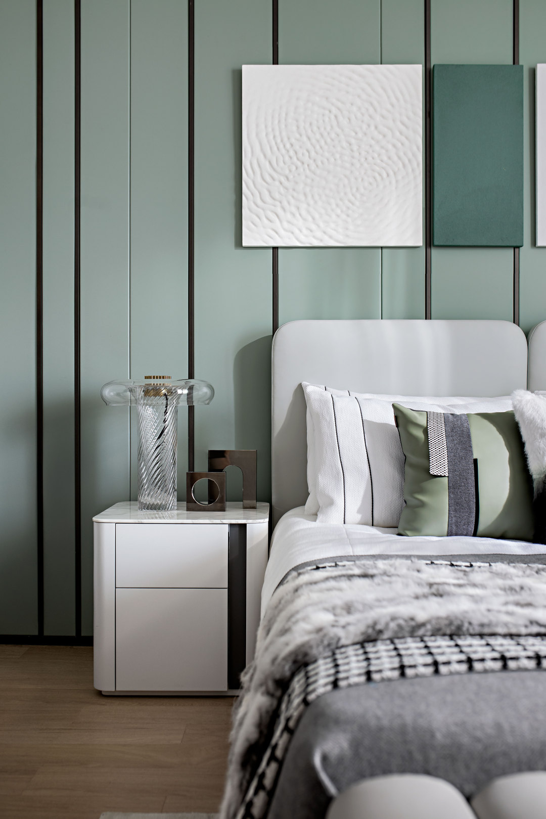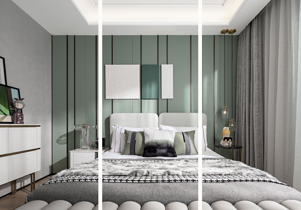 臥室以白色與綠色相結(jié)合,給人四季如春的感覺,床上是柔軟舒適的絨毛皮革,夜晚帶著馬卡龍的甜美氣息進(jìn)入夢鄉(xiāng),清晨伴著落地紗窗透進(jìn)來的暖陽醒來。
