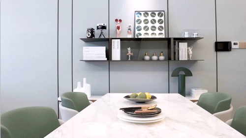 餐桌上擺放的花藝帶來陣陣芳香,旁邊安置了置物架,用來放置圖書和童真的小擺件,整體充滿浪漫的氣息,用全新的輕奢之美融入感官體驗。