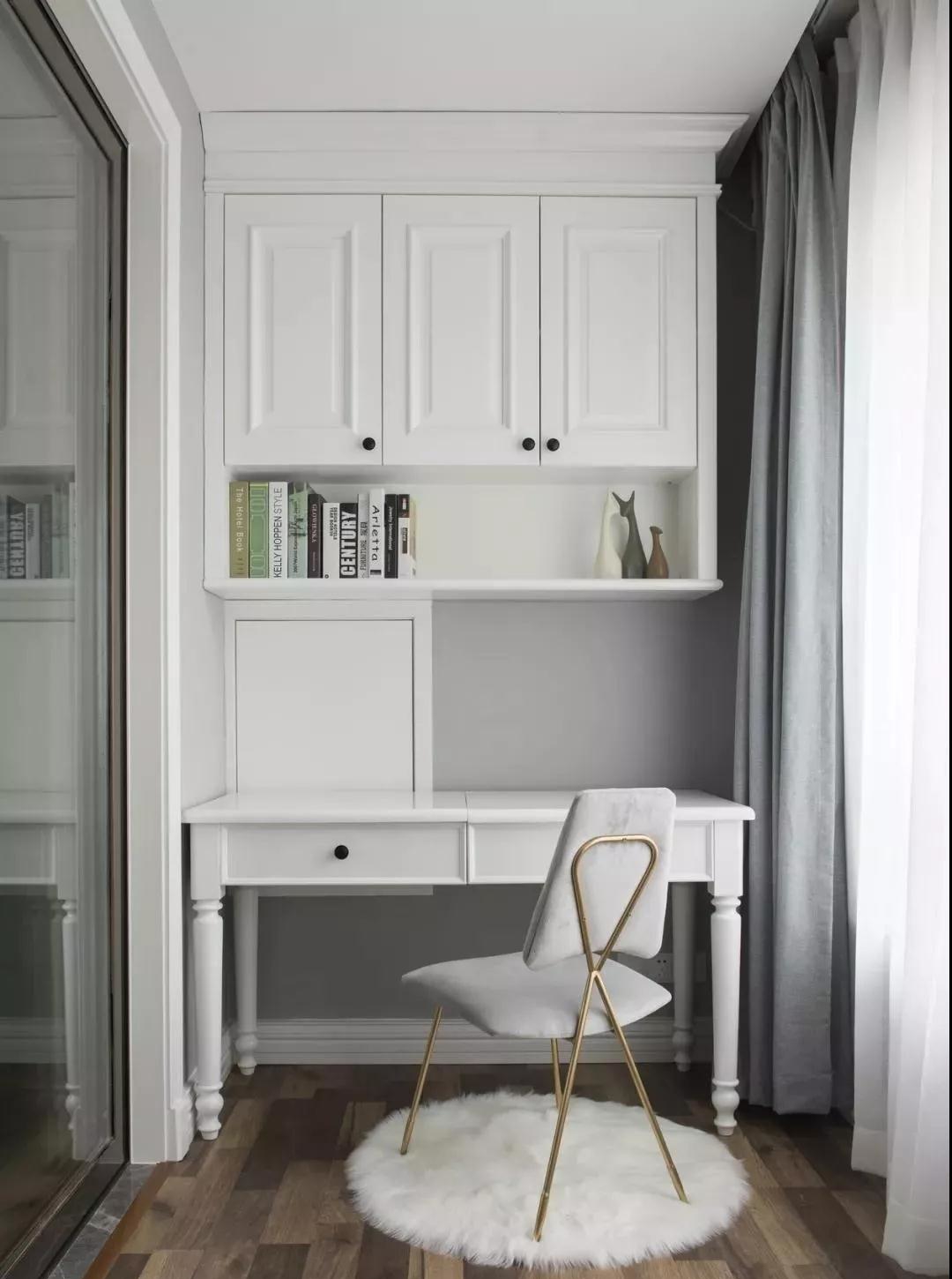 用陽臺改造而成的書房,光線明亮充足,白色的的桌椅書柜,滿足使用性的同時看起來干凈整潔,金屬的椅子和絨毛制品是輕奢風(fēng)最具代表的裝飾,讓整體看起來貴氣十足。