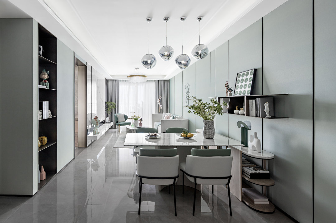 餐廳與客廳相連,沒有明顯的分隔,簡約的鏡面吊燈裝飾,馬卡龍綠的餐椅搭配簡單的大理石餐桌,色調(diào)清新明快。