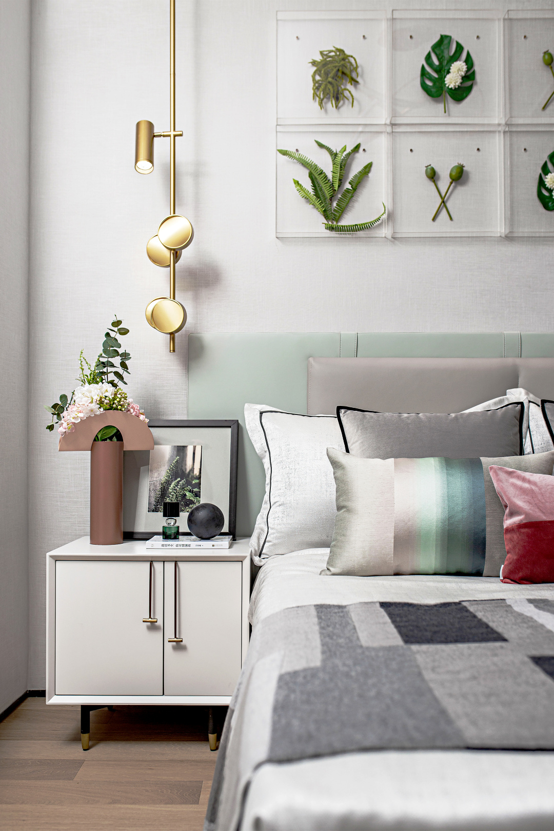主臥使用植物標(biāo)本制成的陳設(shè)掛畫,白色的床頭柜擺放上照片和鮮花,給人自然繁茂、欣欣向榮、萬物復(fù)蘇的美好,床頭黃銅色的金屬掛燈細(xì)膩而充滿高級感。