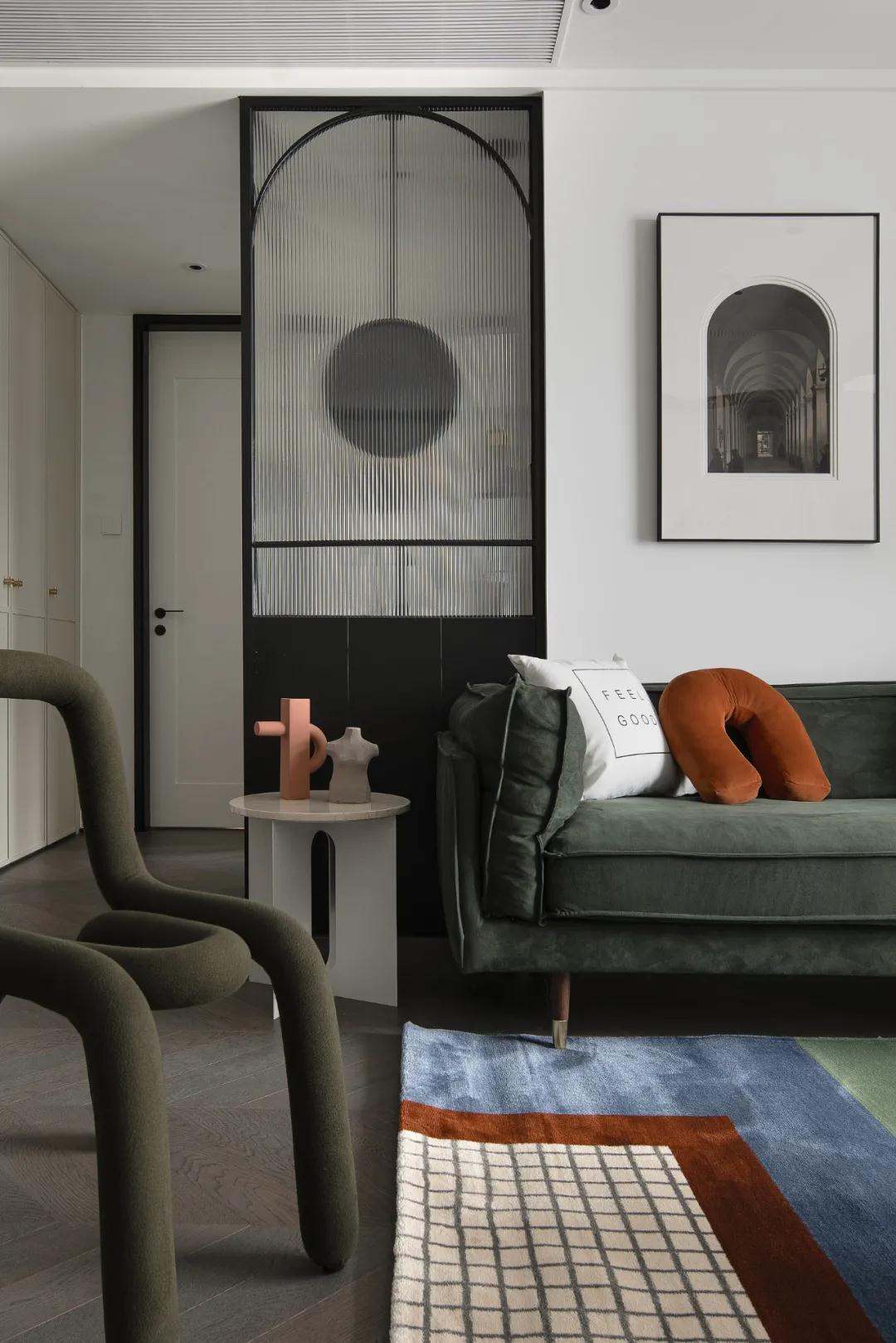 沙發(fā)墻上的掛畫,乳膠漆涂刷出來的圓弧造型,用來隔斷客廳與洗手臺(tái)的長(zhǎng)虹玻璃門,三個(gè)材質(zhì)不同的拱形,相映成趣。