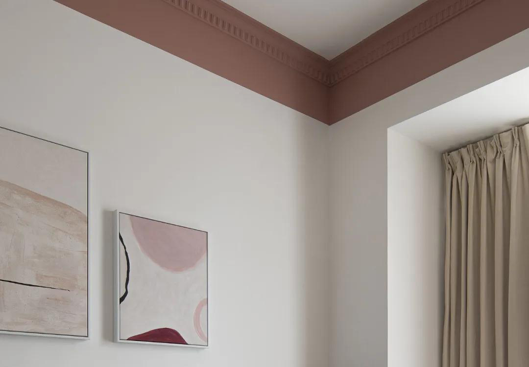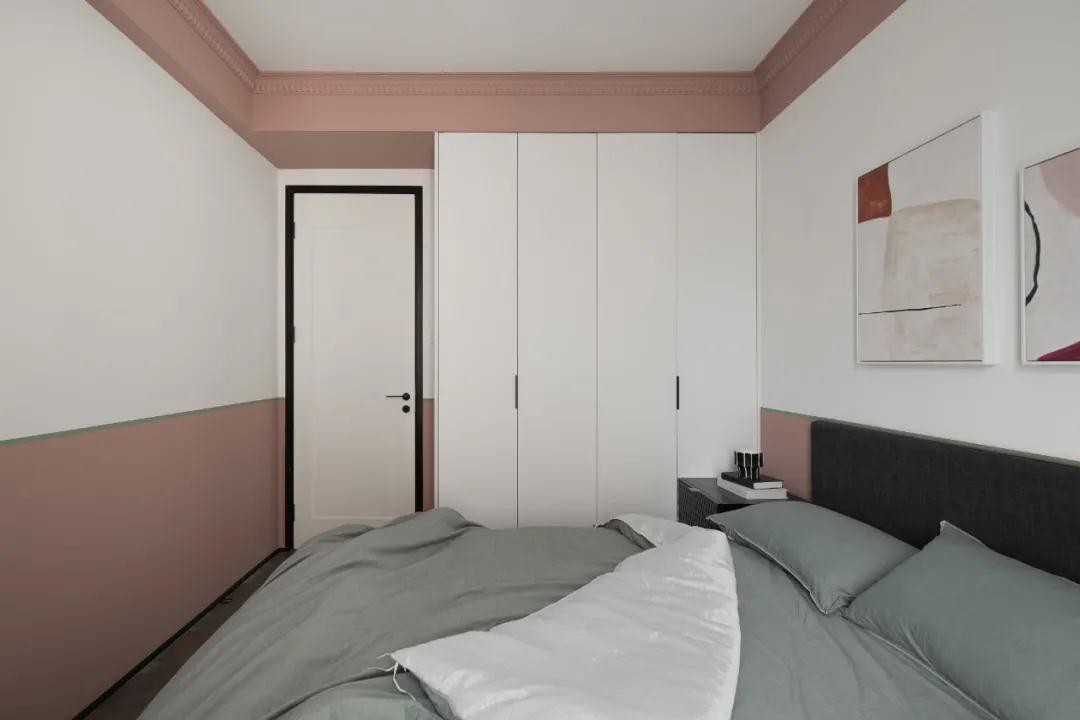 女兒房以粉色為主色調(diào),用綠色的線條將粉色與白色間隔開,小小的細(xì)節(jié)豐富了視覺效果,綠色的床被枕頭與粉色相對(duì),上下拼色的窗簾,頂面使用PU線條勾勒,讓女兒房充滿色彩層次感的同時(shí),更加優(yōu)雅精裝。