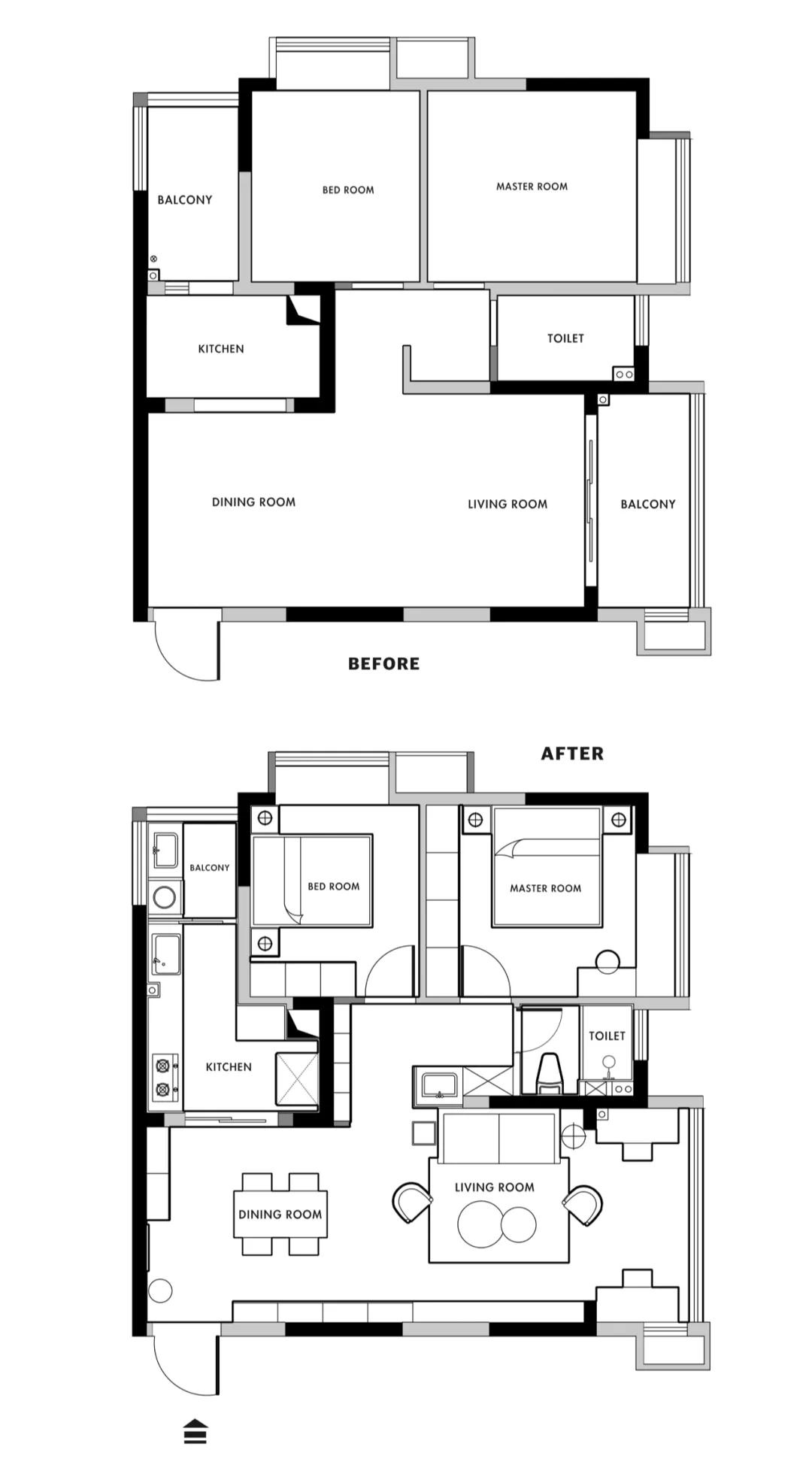 由于業(yè)主夫妻的工作性質(zhì),有大量的時(shí)間需要在家辦公,所以我們把開放式陽臺(tái)納入客廳,并將其改造成適用于辦公的地方,一人一端的桌椅,讓兩人擁有充足的辦公空間。