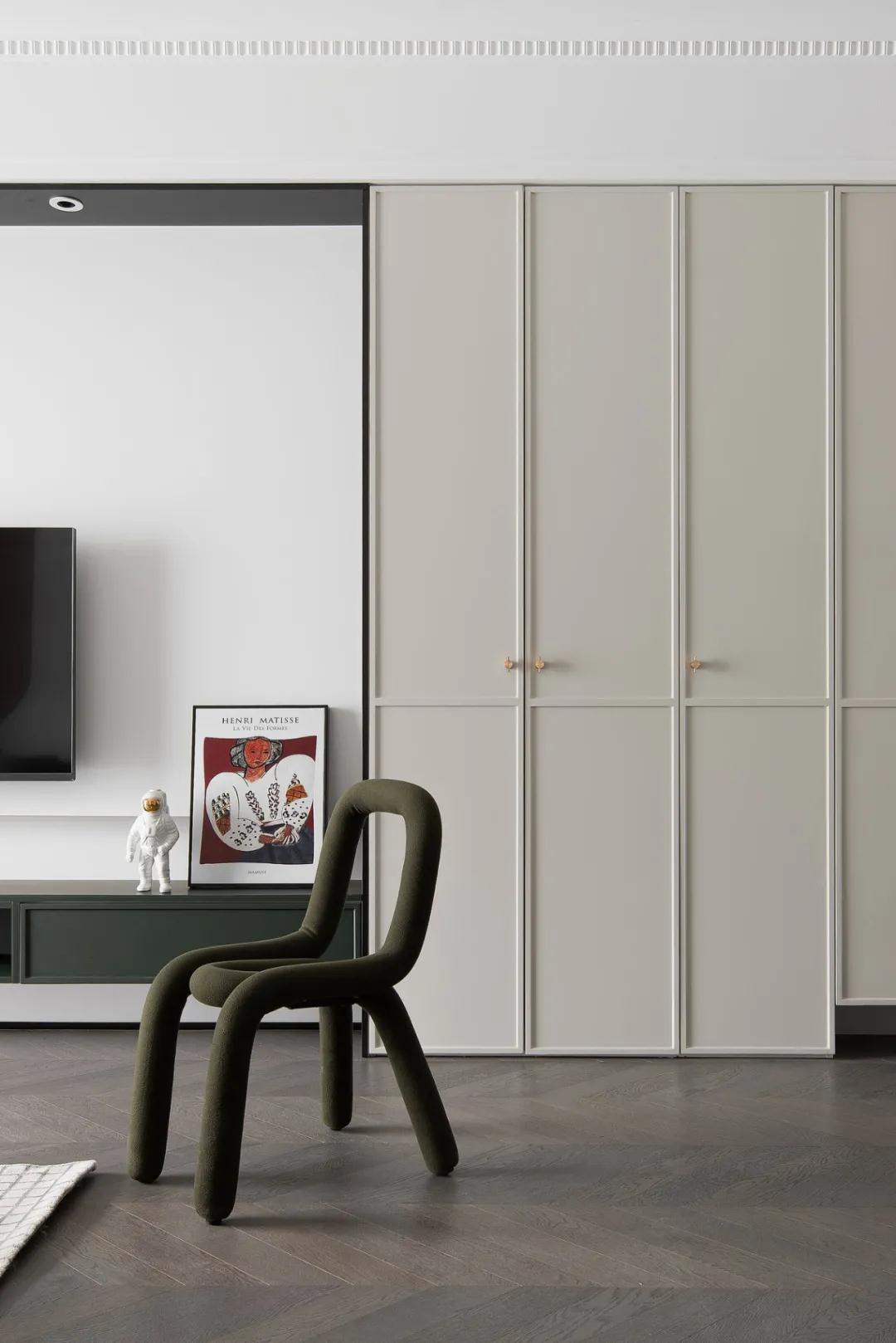 不規(guī)則的色彩碰撞加上格紋與波點(diǎn)的圖案搭配的地毯,輕巧的bold chair椅子,“憨厚”的大象形狀的換鞋凳,電視柜上的畫作與宇航員擺件,餐柜旁充當(dāng)門神的kaws公仔,充滿著讓人輕松且活潑好動(dòng)的童趣。