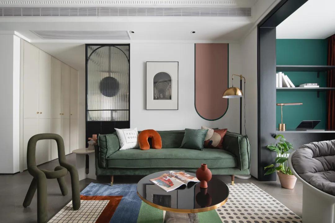 客廳的墻壁以白色為主調(diào),加入低飽和度的墨綠、酒紅、臟粉等色彩,加入微量的黃銅色點(diǎn)綴,使整個(gè)空間看起來繽紛、動(dòng)感。