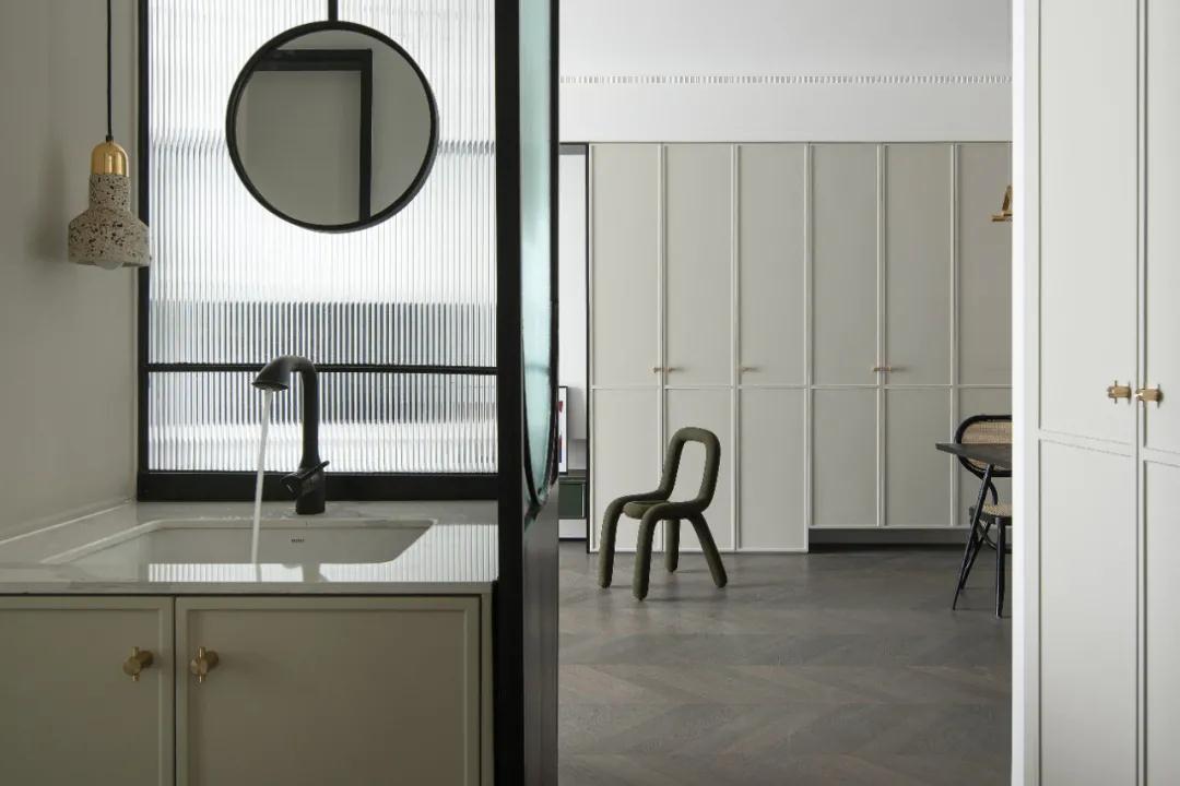 廁所與浴室同門而入,長(zhǎng)虹玻璃門上黑色圓弧的形狀與廚房門相輝映,搭配黃銅把手,墻面延續(xù)公共空間的色調(diào),碧綠色魚鱗磚拼貼而成,淋浴與馬桶區(qū)域分離,做到干濕分離。