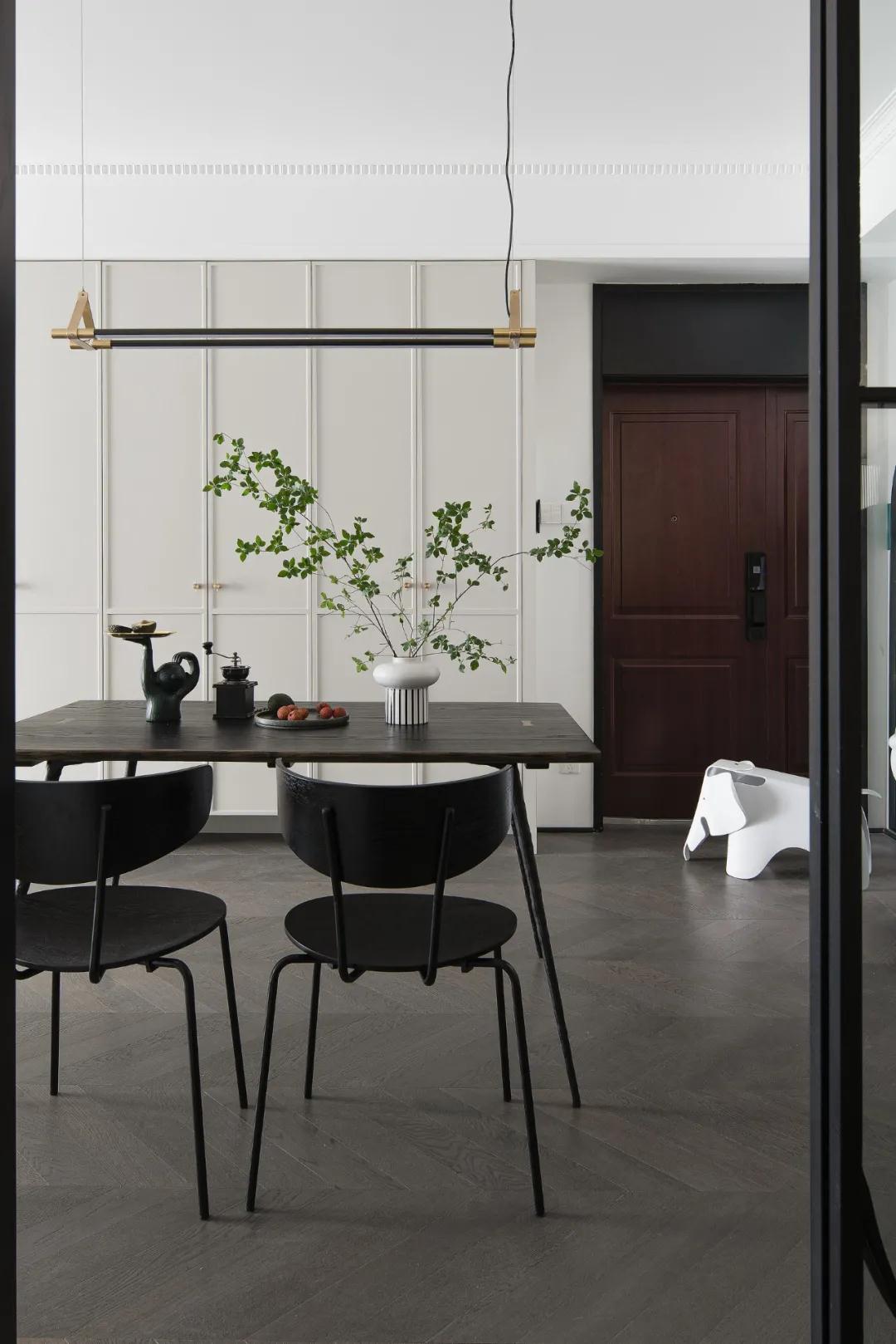 餐廳與客廳相連,以白色為主色調(diào),點(diǎn)綴活潑明亮的粉色和綠色,與黑色沉穩(wěn)的餐柜座椅形成色彩反差,為沉穩(wěn)的空間注入更多的輕盈明亮。餐邊柜上的咖啡機(jī)、復(fù)古音箱、雕塑花盆,桌子上的猴子托盤,讓這個(gè)家充滿故事感。