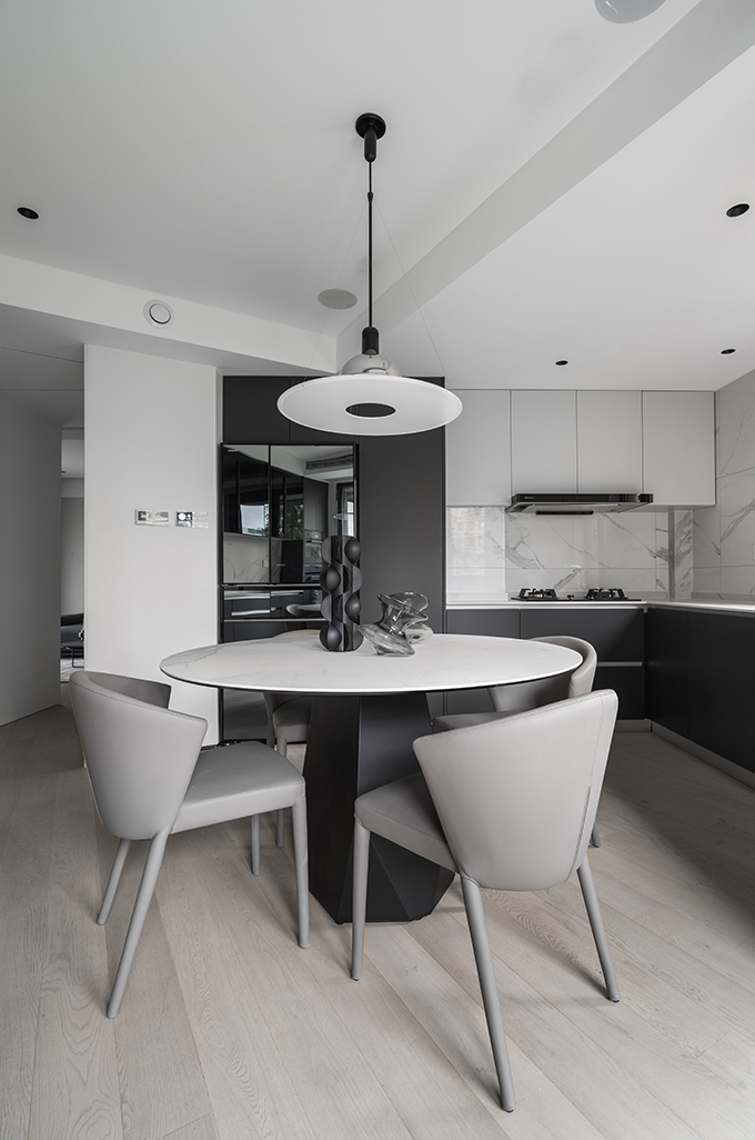 細節(jié)上,大面積的留白,搭配高級灰軟裝,豐富的材質(zhì)和極簡的造型,賦予空間高級質(zhì)感;極具未來感的線性燈光則為極簡家披上華服,其間的精致與溫馨,創(chuàng)造出無限愉悅與驚喜。