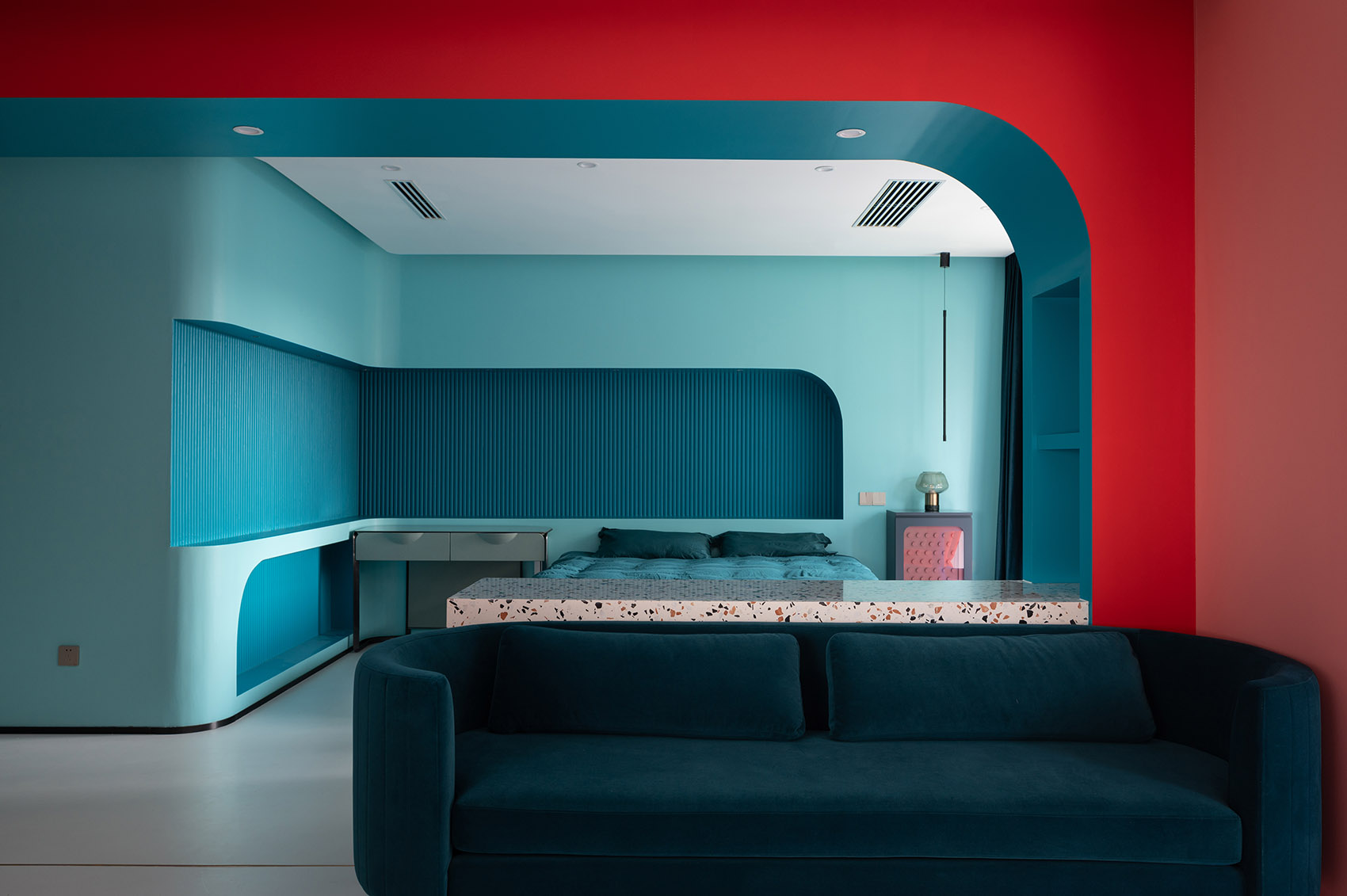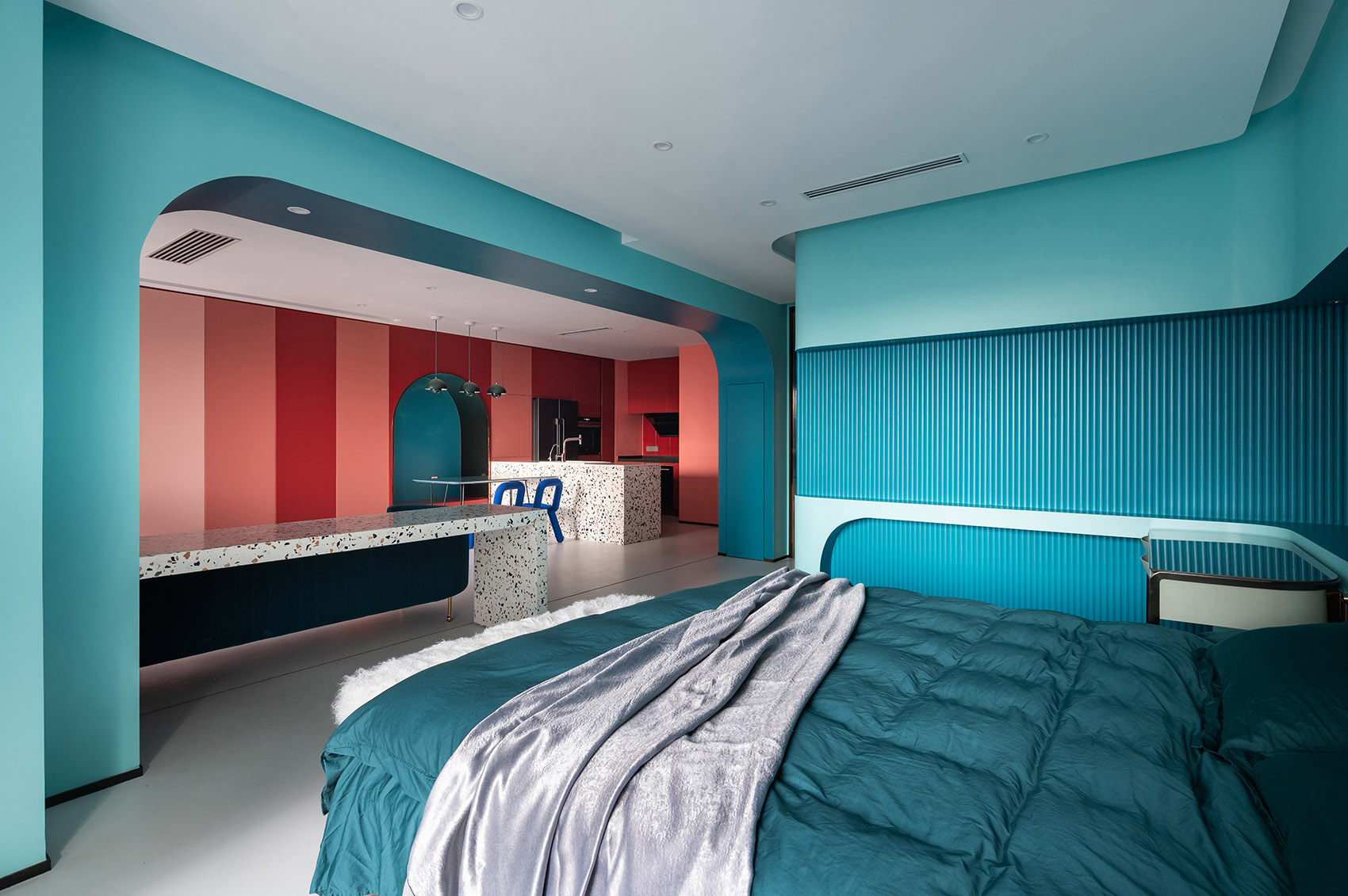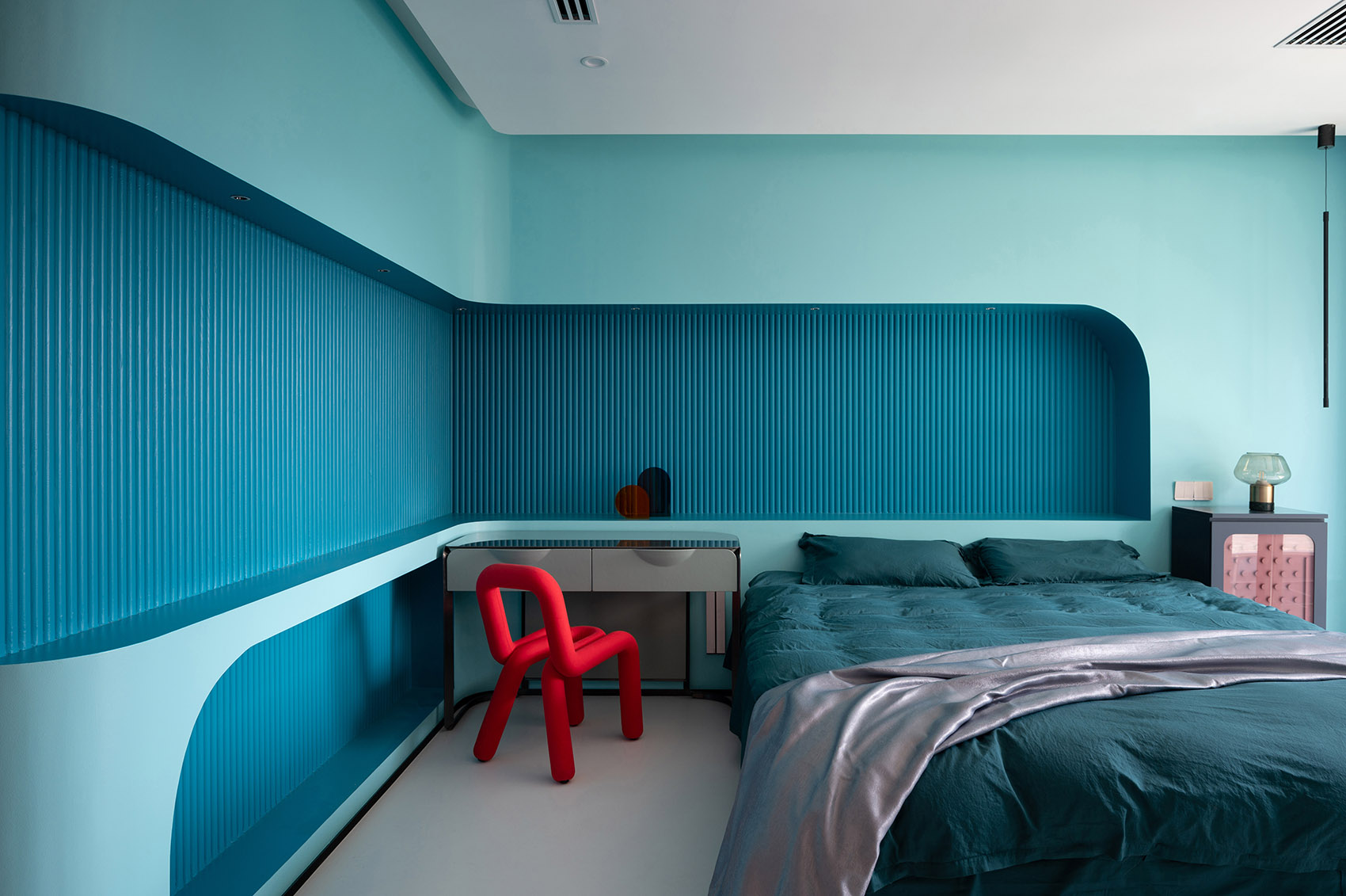 整個空間采用冷暖兩種色系,曲線的造型處理,在滿足功能需要的同時增加使用者不同的體驗感,與業主對色彩的喜好相符。