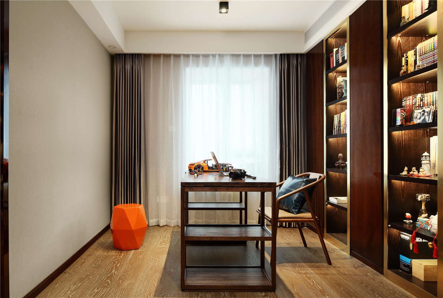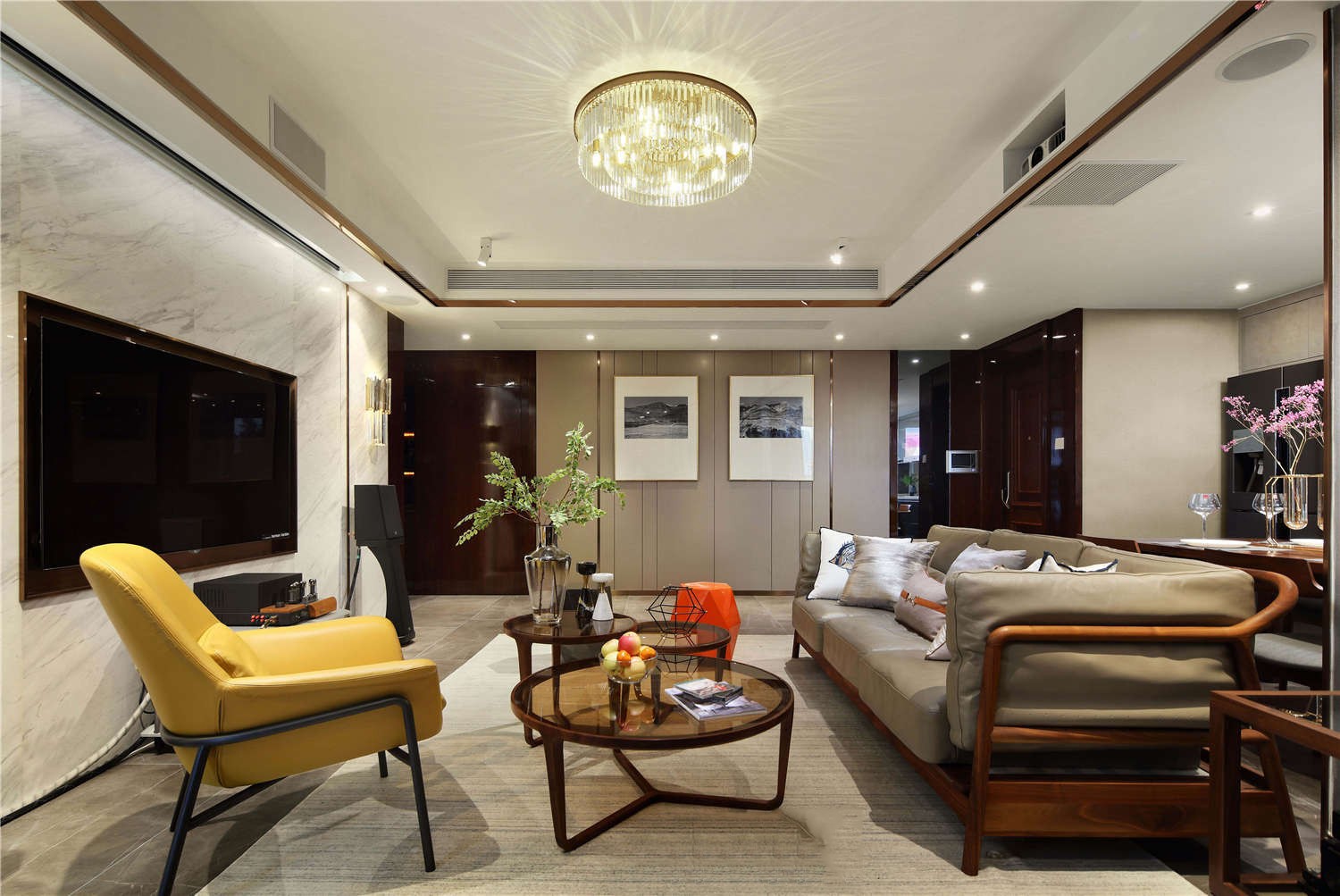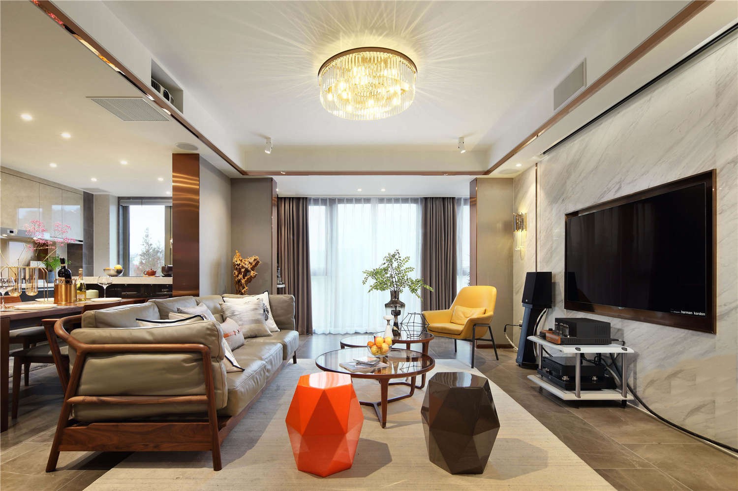 設計師在客廳處運用了一點拼色的設計,明亮的黃色與橘紅,在穩重的風格里增添了一點活潑的氣息。客廳的采光很好,所以即使是深色也不會覺得暗。