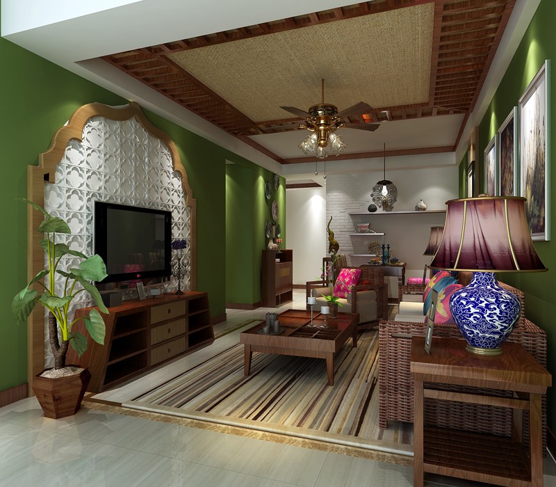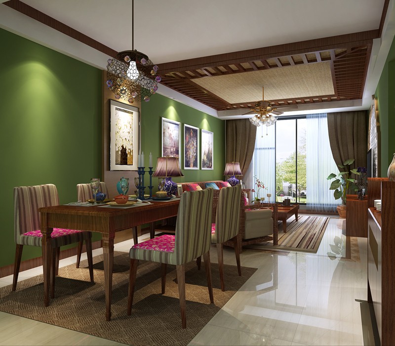 餐廳和客廳那一面綠色的背景墻十分個性,抓人眼球,整體上很符合我們中國人的生活習(xí)慣,但是也多了很多東南亞的風(fēng)情。