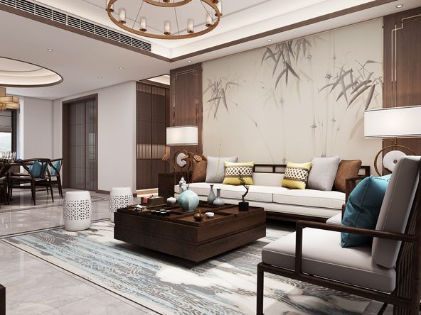 業主很喜歡竹子的風骨,所以設計師把客廳的背景墻做成了墨竹中國畫,寧靜致遠,格調高雅。
