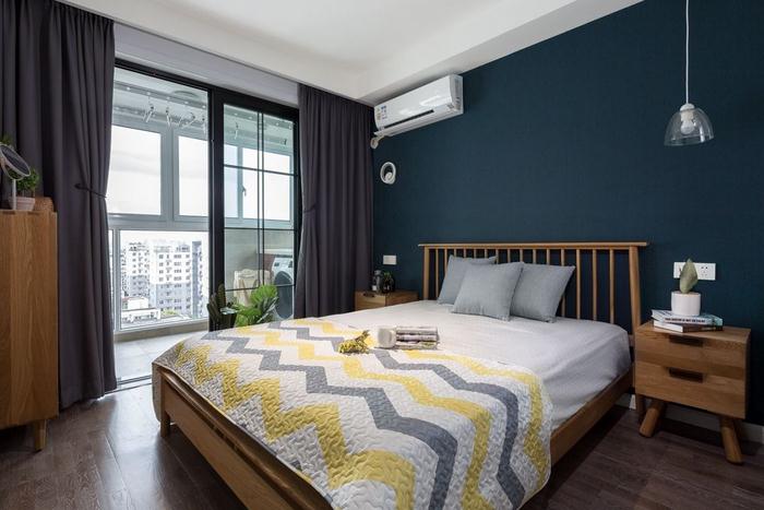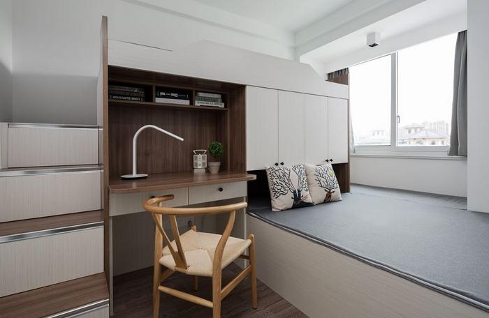 深色的背景墻和淺色的家具搭配在一起,增添空間的層次感。次臥用定制的組合柜做成榻榻米的樣式,節省了占地面積,增加了儲物空間。