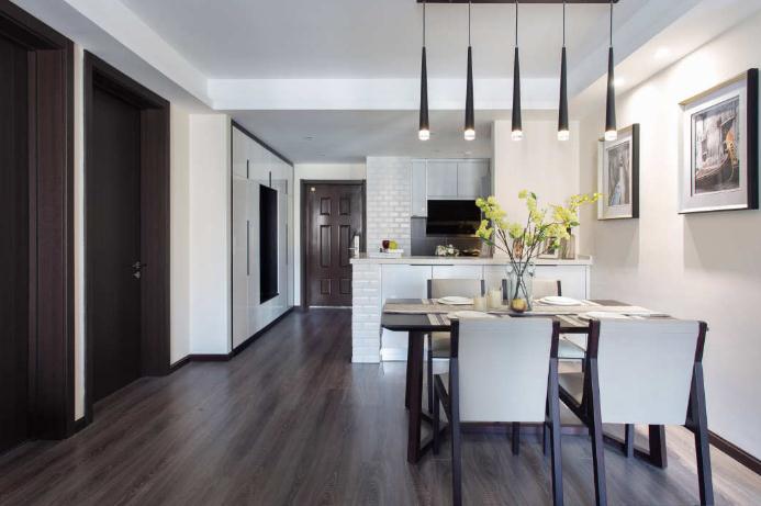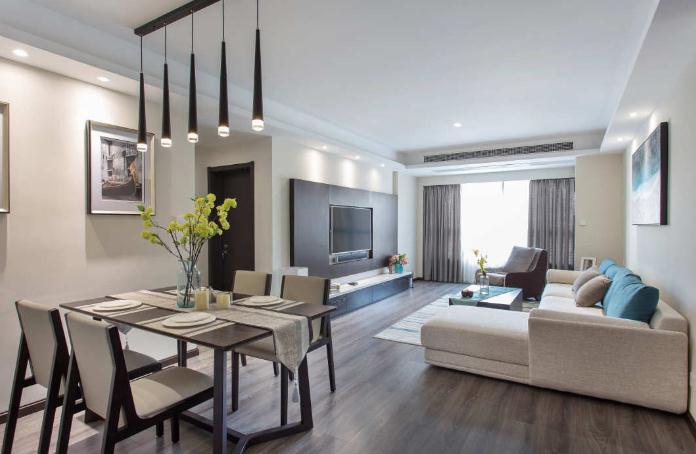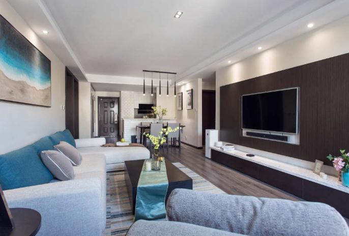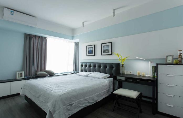 現代簡約風雖然看上去簡單,但是卻不缺乏設計感。客廳和餐廳的風格有連貫性,臥室以天藍色作為裝點,時尚感與溫馨感兼具。