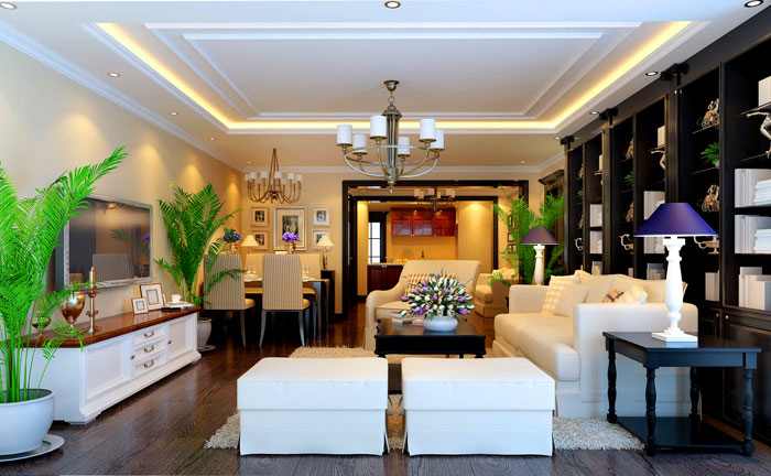 新古典風格既有簡單的美感,也有華麗的裝飾,就像客廳華麗的吊燈與多樣的擺飾,也能很好地搭配純色的沙發。