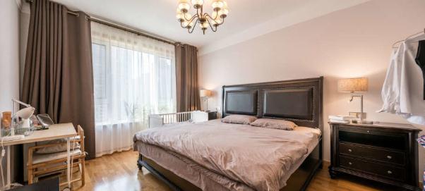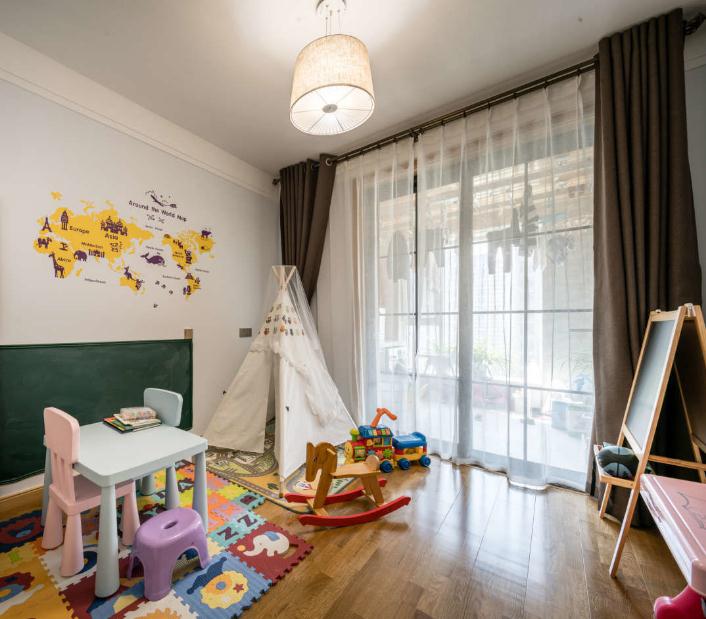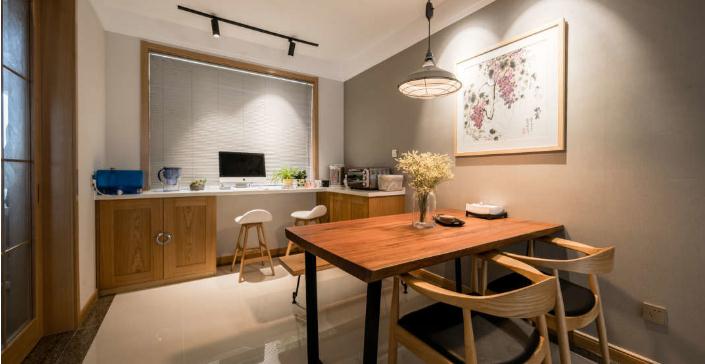 客廳的裝飾簡單雅致,木色與純色的搭配,能夠給人帶來一種靜謐感與舒適感,所以臥室也大量沿用了這一種搭配。餐廳的里邊是一個小型的工作區,射燈集中了光線,方便閱讀和辦公。餐廳兒童房的色彩可以盡量鮮艷多樣一些,有助于激發小朋友的想象力,但是整體上也不宜跟新中式風格相差太遠。