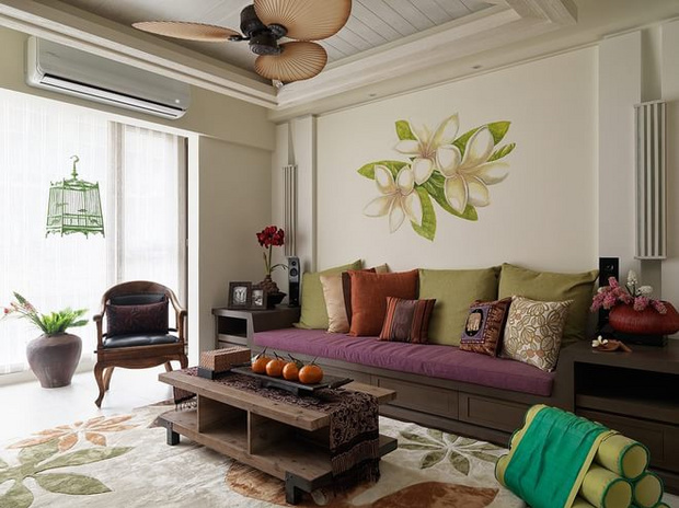 這套東南亞風格的二居室,沒有像之前常見的東南亞風格一樣,大面積使用棕色做裝飾,反而是以白色為主,適當點綴一些民族特色十足的裝飾,因此整體的氛圍比較清新,不會顯得雜亂。設計師往客廳增添了不少綠植,跟背景墻上的花樣相呼應,賞心悅目,沁人心脾。