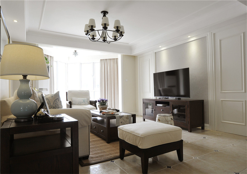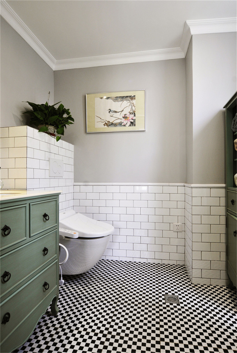 這套新古典風格形式上更為簡約,但是可以從細節上感受它的雅韻。白色的主色調能夠提亮空間,木質的家具可提升格調。廚房和衛生間都鋪設黑線白格的瓷磚,風格上有一致性,也更為時尚、美觀。