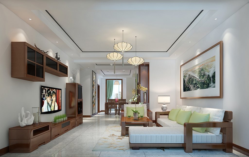 誰說小戶型做不出中式風格的大氣與恢弘,只要搭配合理,小戶型的中式風格同樣格調高雅,韻味十足。為了讓整個空間看起來更通透明亮,設計師用白色作為家居環境的主色調,電視背景墻也沒有做過多的裝飾,只是簡單放置了兩排儲物柜。