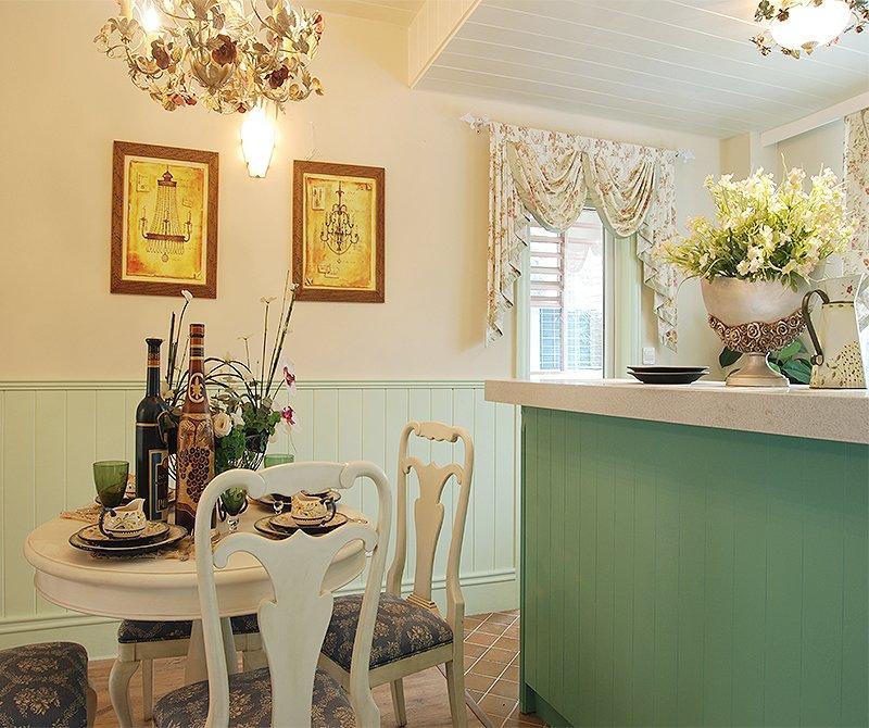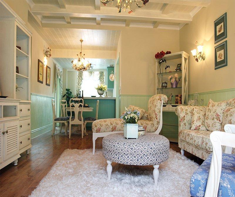 這是一套很典型的美式田園風格案例,浪漫的碎花搭配上清新的綠色,有一種田園鄉下別墅的感覺。因為客廳的面積比較小,所以設計師注重打造家居生活的溫馨感,暖黃的燈光永遠是田園風格中不可或缺的元素之一。