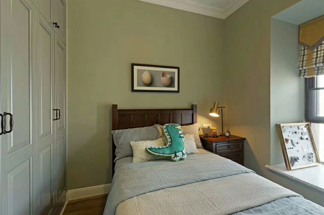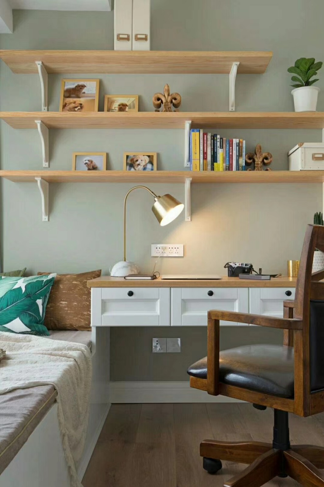 田園風格并不是只有碎花這一個選項,清新的綠色搭配上深色的木質家具,整體效果立馬就不一樣了。復古風的設計,有一種來到了田園小屋的感覺。次臥面積不大,所以用榻榻米+組合書桌的方式來裝修,用置物隔板增加儲物空間,一點都不會擁擠和累贅。
