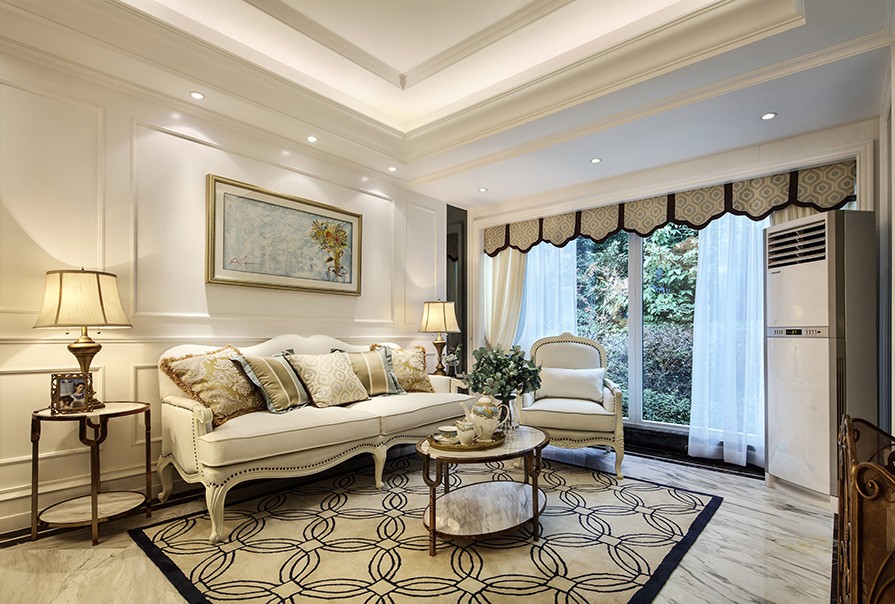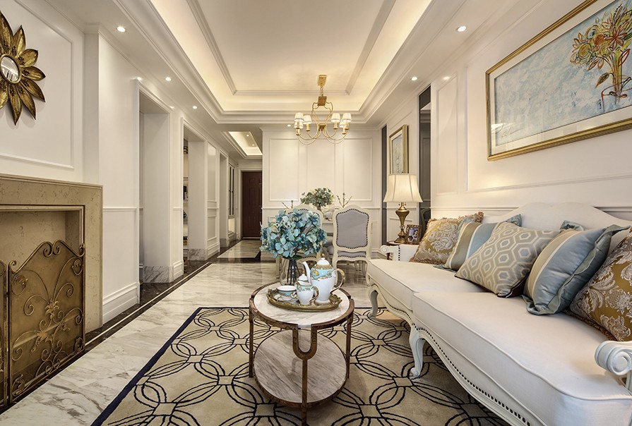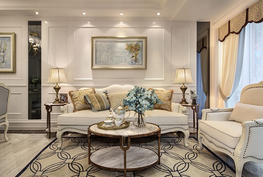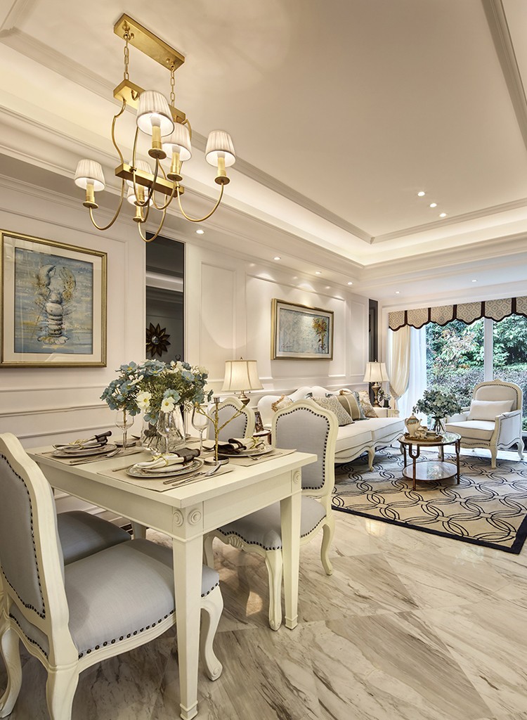 這套歐式風格在硬裝上保留歐式神態,軟裝上則放棄了歐式家具的雍容華貴,用淡藍色布藝配合白色家具輪廓,更符合當代人的生活習慣與品位。設計師在材料選擇上多用的用純色系,家具的線條十分簡潔,能夠進一步提升空間感。