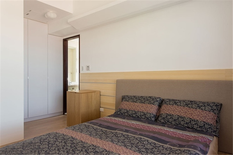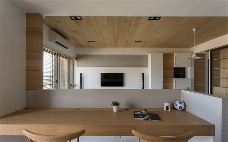 日式極簡風格的魅力在于,用最簡單的排列與組合,打造出最舒適的家居空間。開放式的書房就設置在沙發背后,通透的采光打造出了一個良好的工作環境,因為平時只有業主夫妻倆在家,所以也不擔心會被打擾。