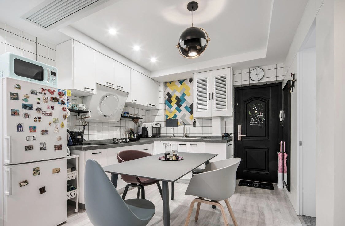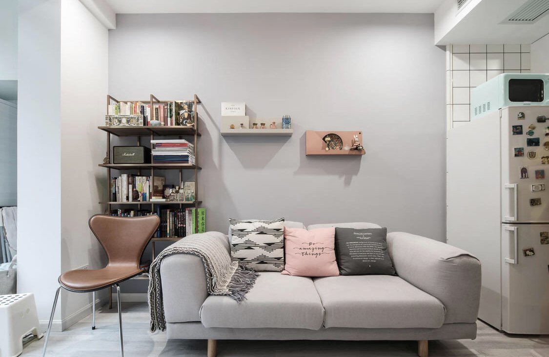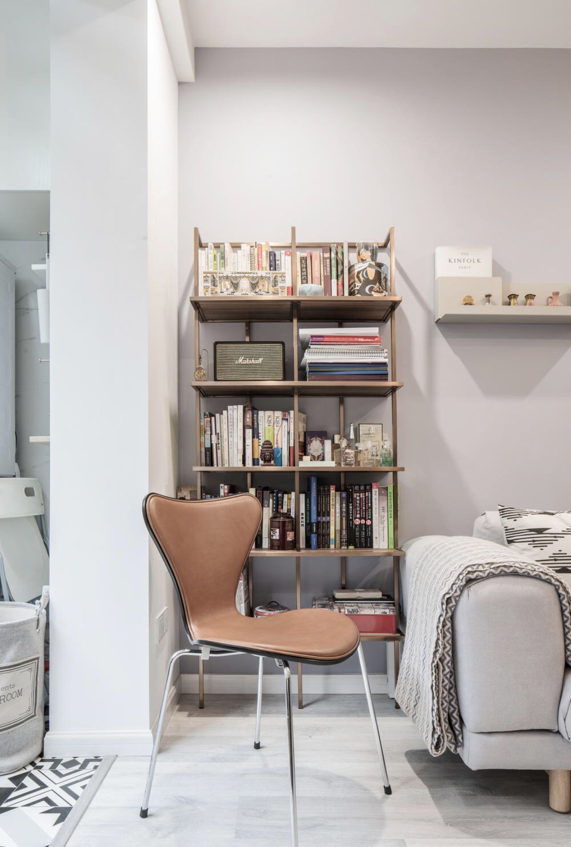 這套北歐風(fēng)的裝飾比較簡(jiǎn)單,整體上以白色和灰色為主,適當(dāng)用亮色增點(diǎn)空間,簡(jiǎn)潔又活潑。業(yè)主想要一個(gè)工作區(qū),所以設(shè)計(jì)師在陽(yáng)臺(tái)一側(cè)簡(jiǎn)單布置了一下,卡座的設(shè)計(jì)既不會(huì)占據(jù)太大空間,還有儲(chǔ)物的功能。