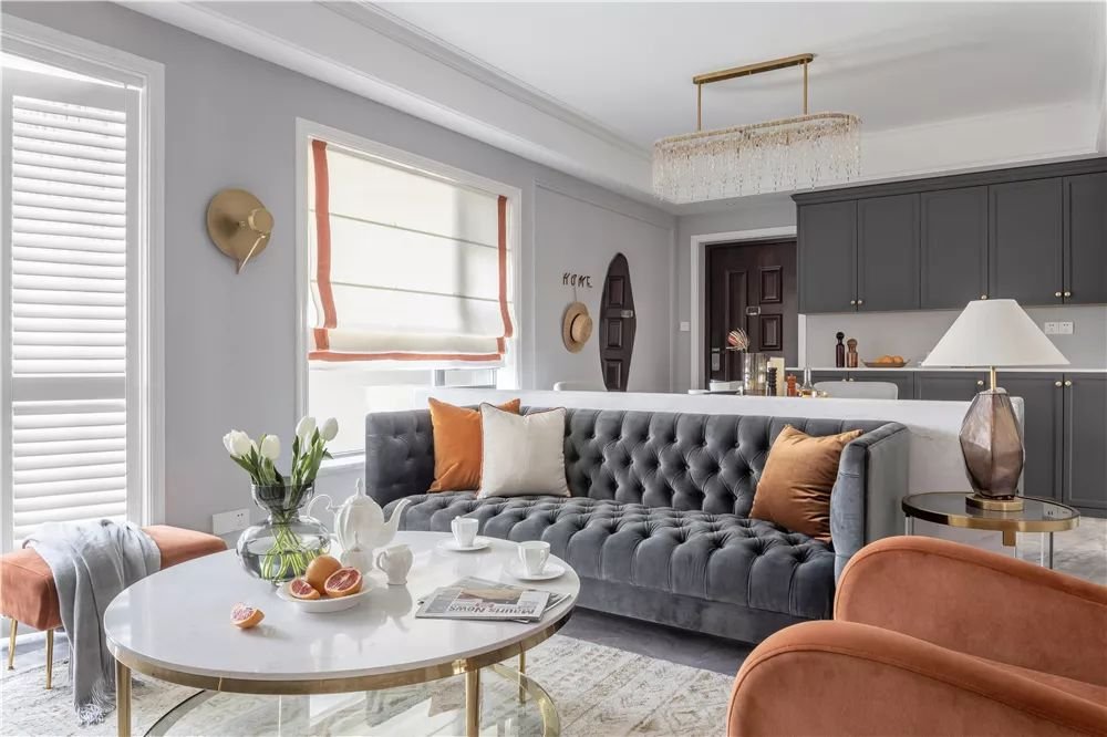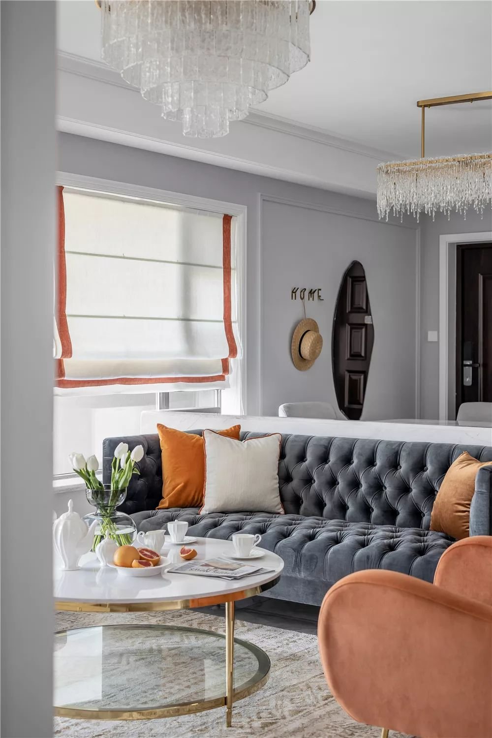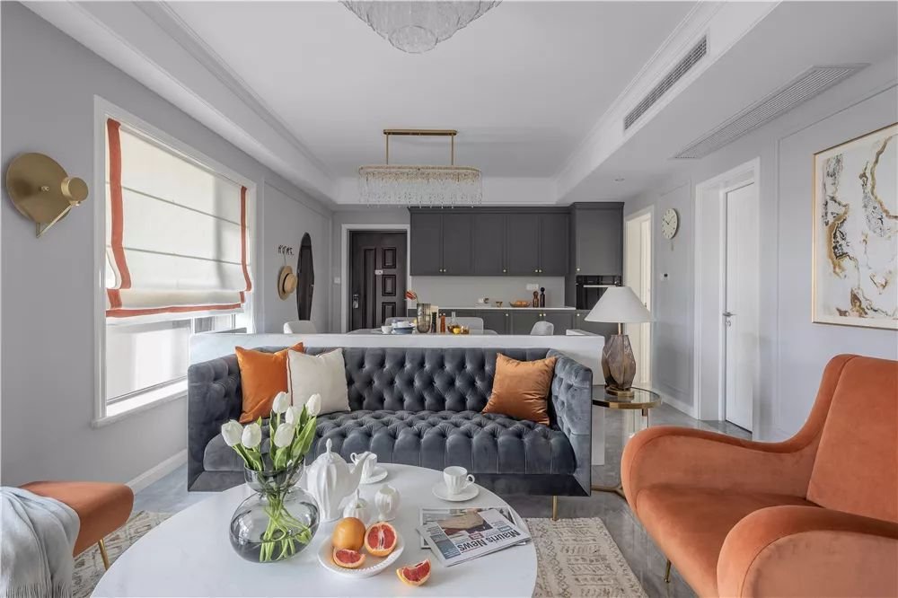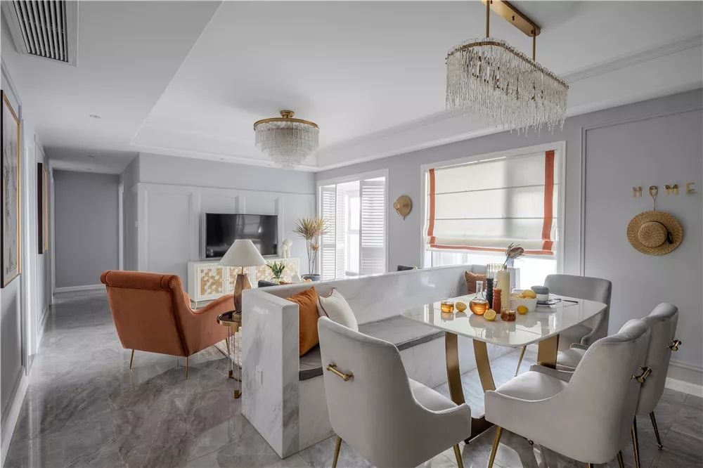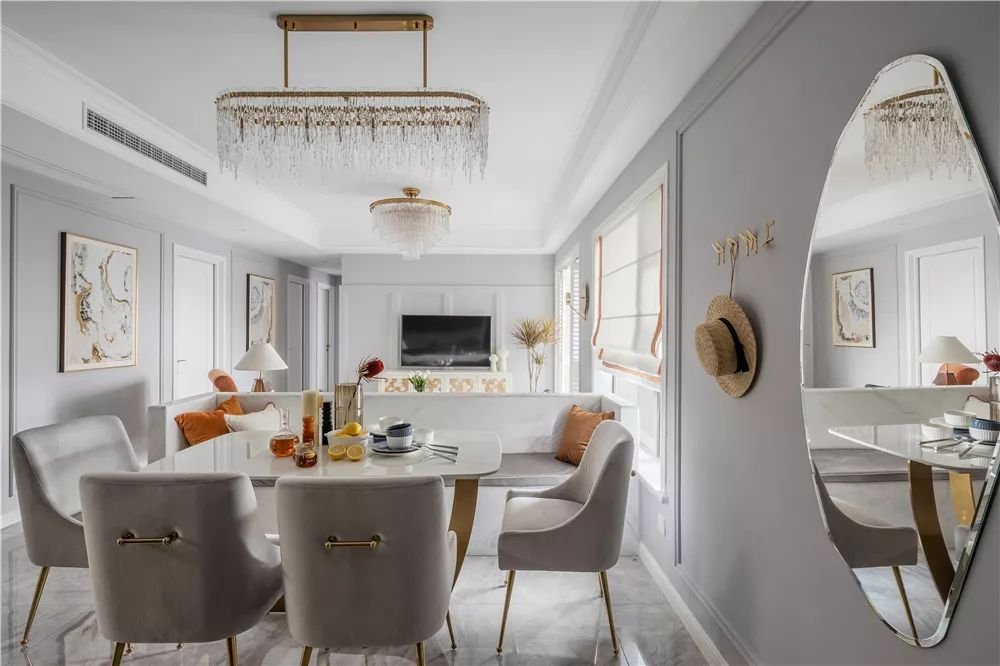 這是一套法式輕奢風格的三居室,古典優雅,質感十足。客廳、餐廳和玄關同屬一個空間,所以風格設計上要保證它的一致性。亮色的單人沙發和抱枕可以提亮整個空間,優雅又不失活潑。