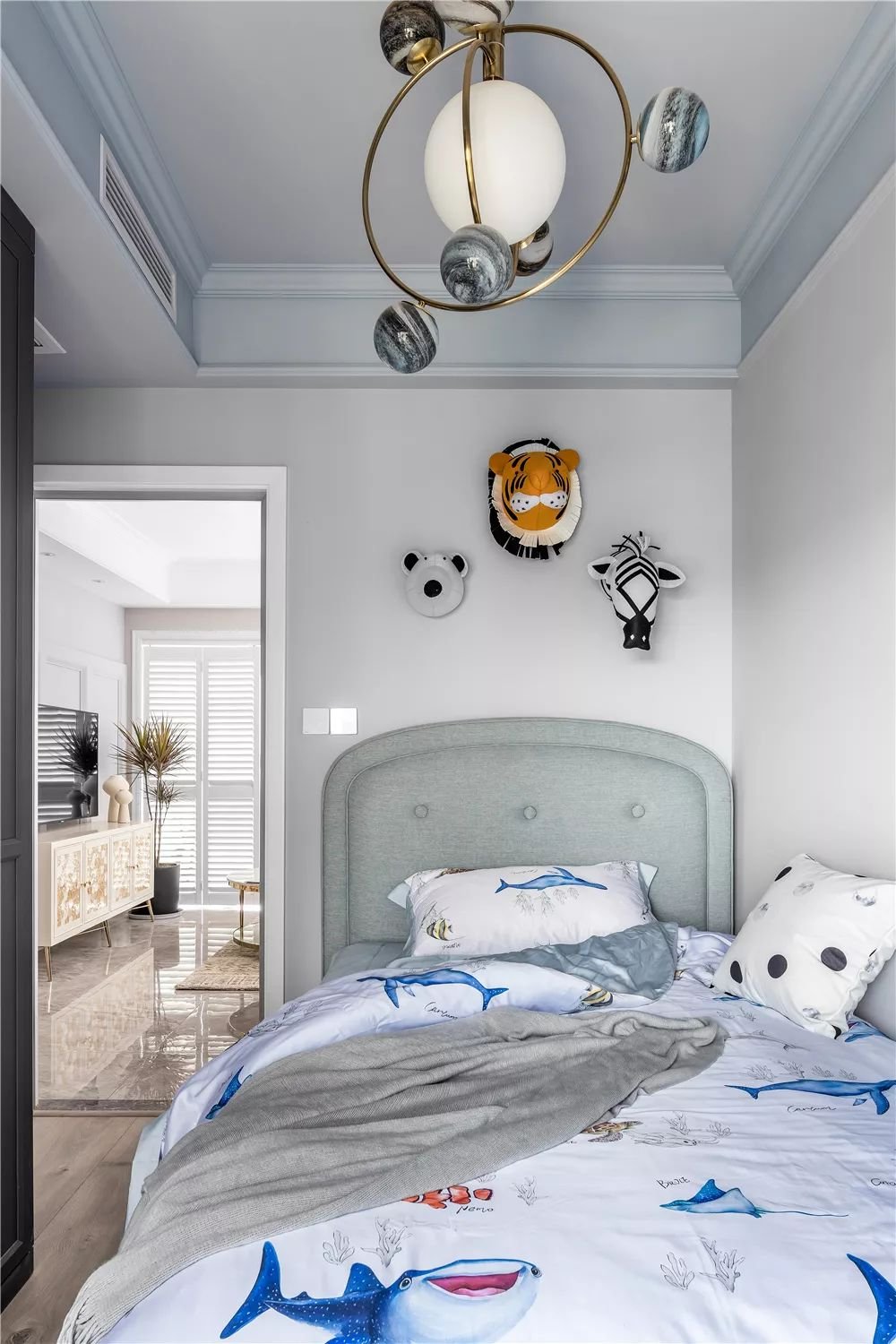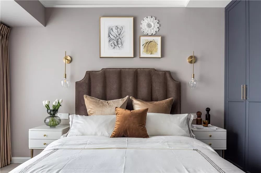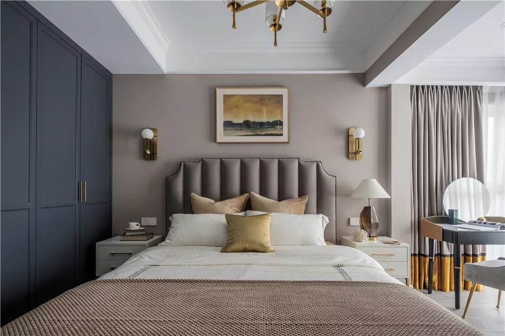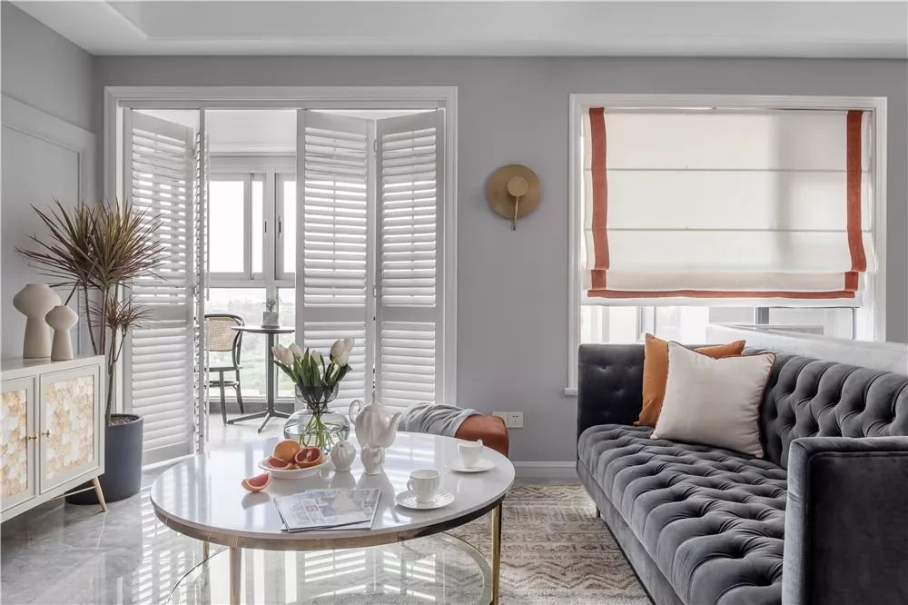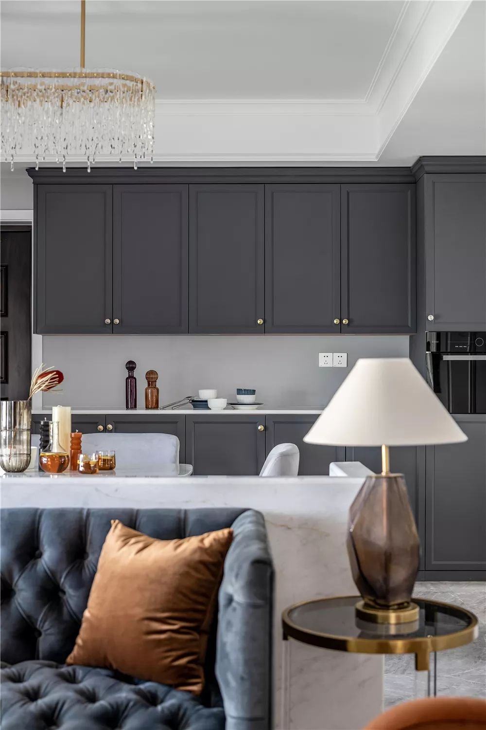 這是一套法式輕奢風格的三居室,古典優雅,質感十足。客廳、餐廳和玄關同屬一個空間,所以風格設計上要保證它的一致性。亮色的單人沙發和抱枕可以提亮整個空間,優雅又不失活潑。