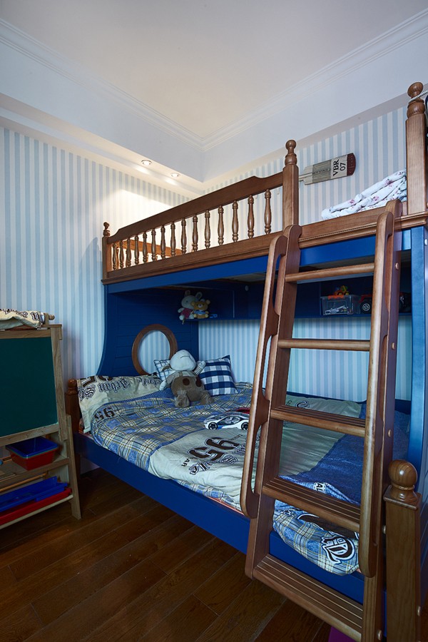 美式的復古感在這套三居室中展現得一覽無遺,貴氣、隨意又自由的氛圍,讓美式風格備受中國業主的歡迎。兒童房這邊用的是高低床,平時上床很少使用,后期可以用來放置一些雜物。