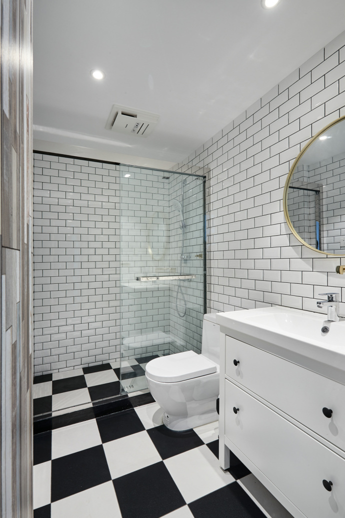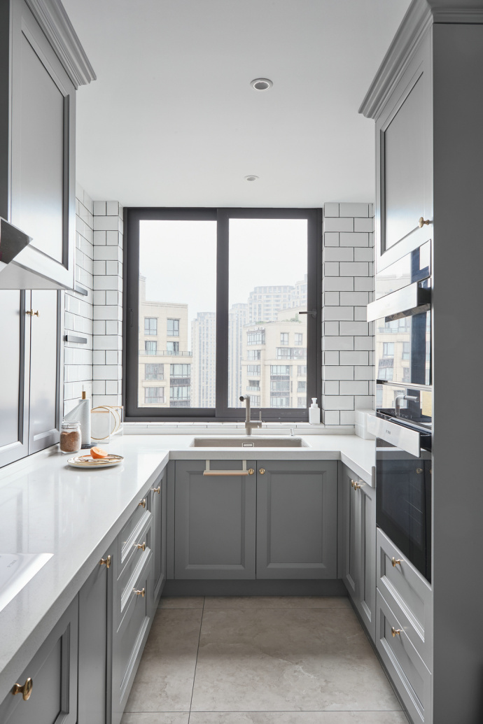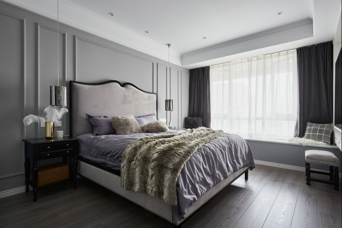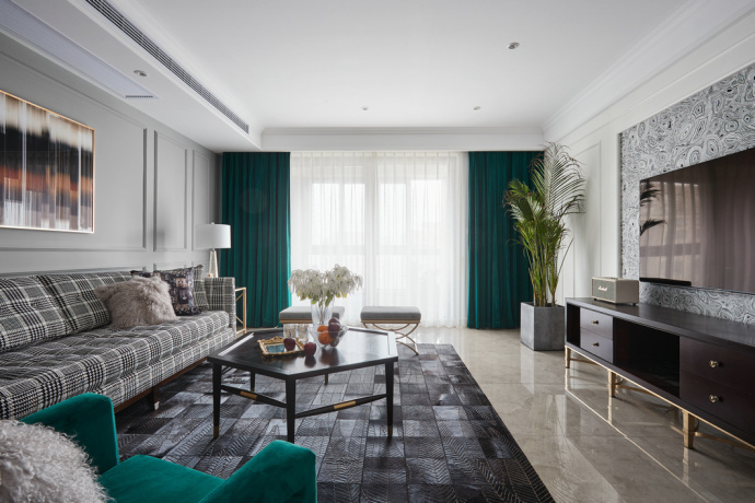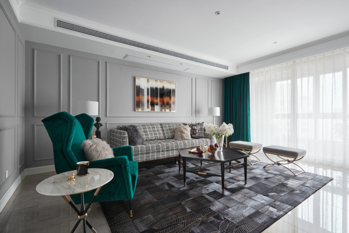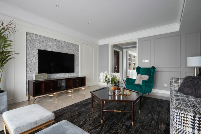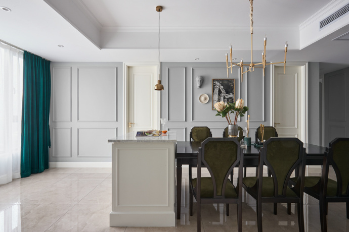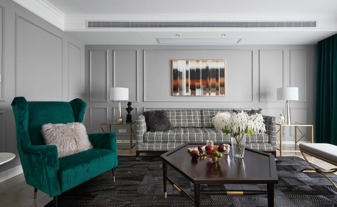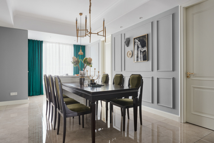 這套現代風格大面積使用護墻板做裝修,雖然成本更高,但是視覺效果的確很好,灰色的護墻板看起來質感十足,高貴大氣上檔次。墨綠色的軟裝做點綴,能給整個空間添上一點活潑的色彩。