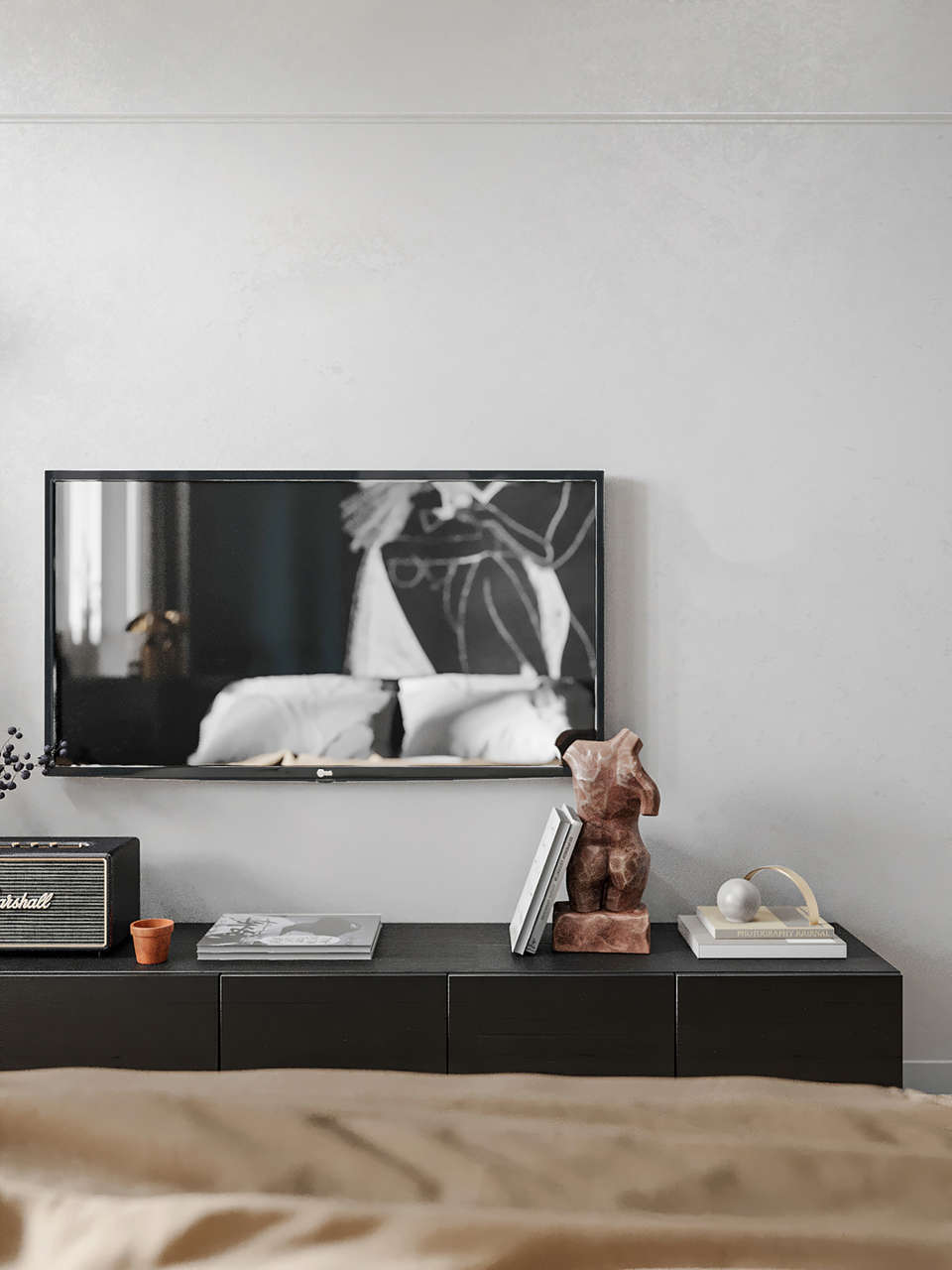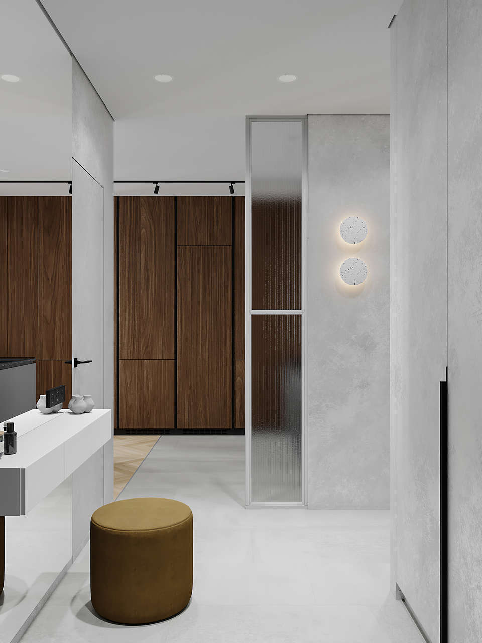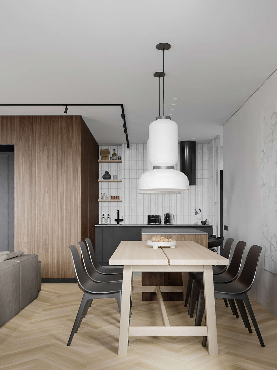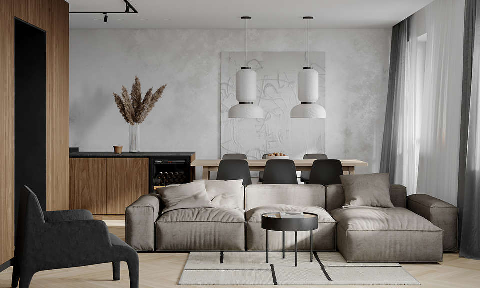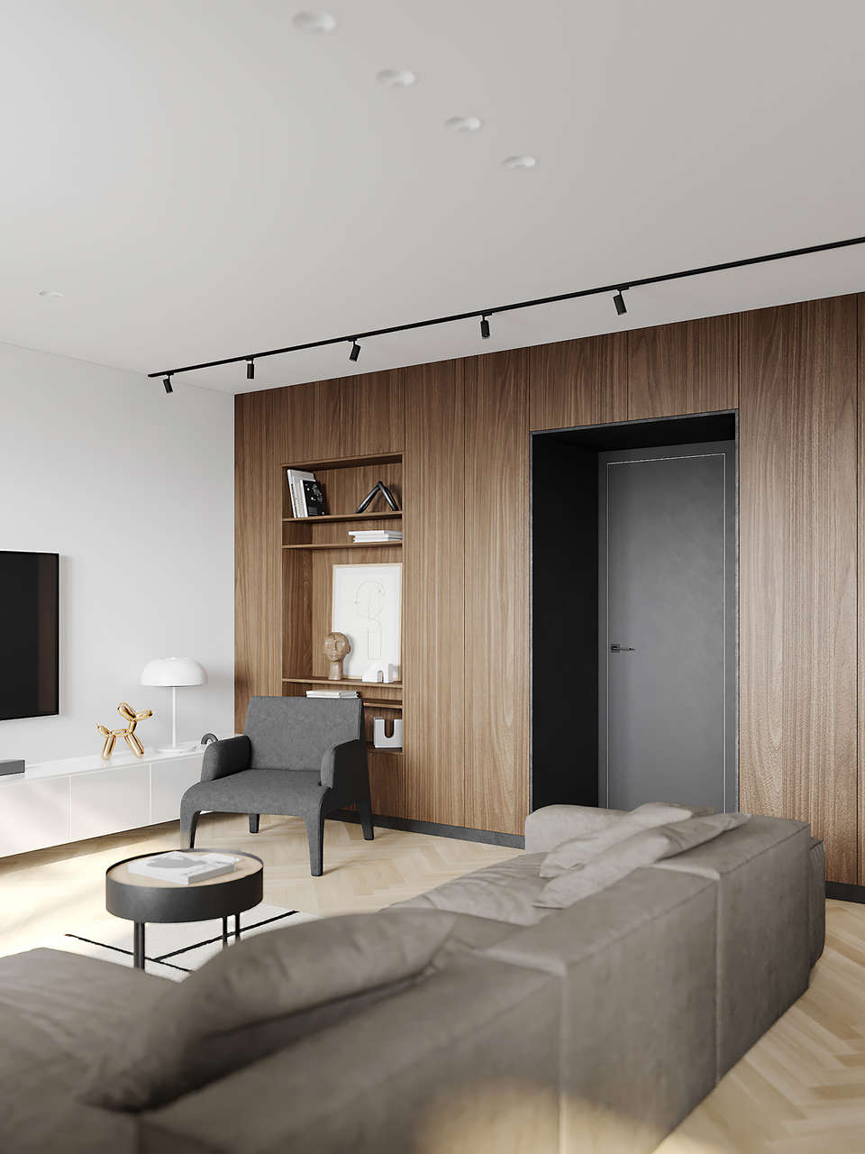 只保留一間居室,打造簡潔明亮的家居環境,以高級灰搭配原木色,充滿高級感也溫馨舒適。