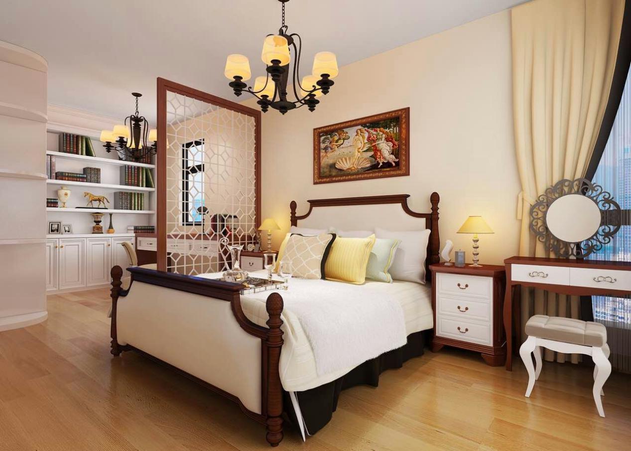 為了合理規劃空間,設計師把書房放進了臥室里,只用一個鏤空的屏風簡單隔開,這樣一來,臥室和書房都不會顯得很擁擠,整個空間都開闊了不少。